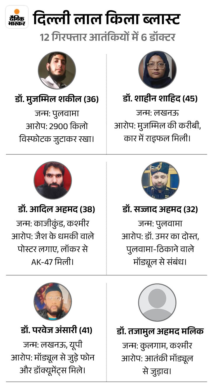 दिल्ली में लाल किला के पास 10 नवंबर को हुए धमाके के पीछे जैश-ए-मोहम्मद का नया वाइट कॉलर टेरर मॉड्यूल (आतंकियों का ग्रुप) उजागर हुआ है। इस मॉड्यूल में डॉक्टर, प्रोफेसर और महिला सदस्य शामिल थे, जो पाकिस्तानी हैंडलर्स के सीधे संपर्क में थे।
