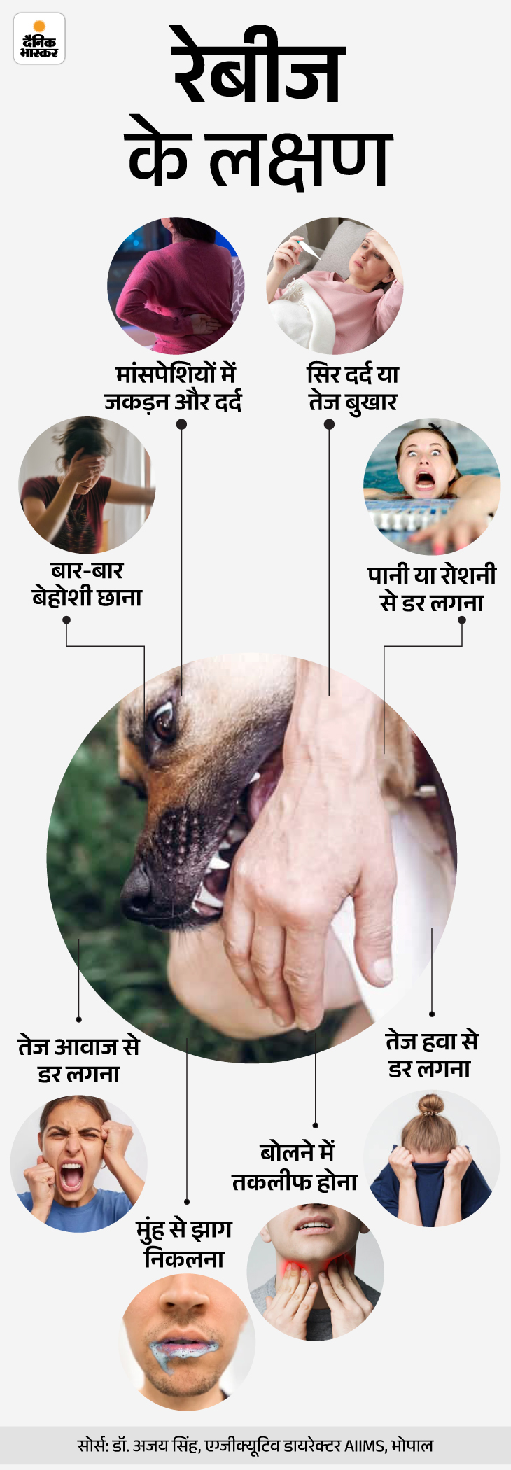 रेबीज के लक्षणों में सबसे पहले काटने वाली जगह के आसपास चुभन और खुजली महसूस होती है। व्यक्ति को तेज बुखार और मांसपेशियों में दर्द हो सकता है। रेबीज वायरस धीरे-धीरे नसों के जरिए ब्रेन तक पहुंचता है। इसके बाद के सभी लक्षण ब्रेन से जुड़े होते हैं। इसमें सबसे कॉमन लक्षण पानी को देखकर डर लगना है। कूलर या पंखे की तेज हवा से डरना भी इसका एक लक्षण है। इसके अलावा इसके कुछ अन्य लक्षण भी हैं, इसे नीचे दिए ग्राफिक से समझिए….