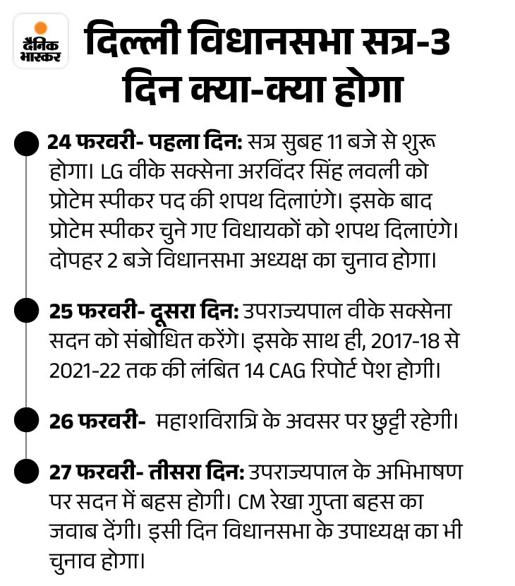 दिल्ली विधानसभा का सत्र सोमवार से शुरू हो रहा है। यह 27 फरवरी तक चलेगा। 26 को शिवरात्रि की वजह से छुट्टी रहेगी। पहले दिन प्रोटेम स्पीकर अरविंदर सिंह लवली को LG वीके सक्सेना शपथ दिलाएंगे। उसके बाद प्रोटेम स्पीकर विधायकों को शपथ दिलाएंगे।