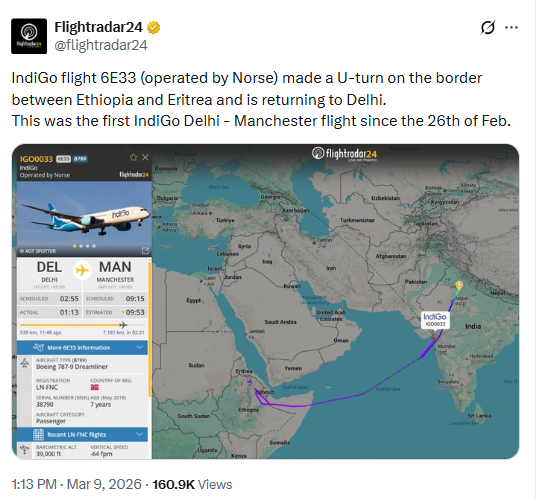 - IndiGo Delhi Manchester 6E33 Flight U Turn | Middle East Airspace Closure