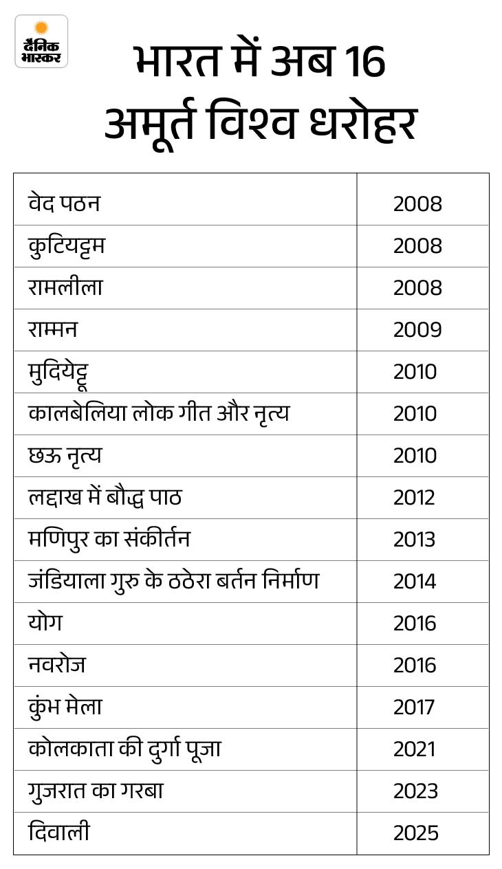 फिलहाल, भारत की 15 धरोहरें पहले से अमूर्त विश्व धरोहर की सूची में जगह बना चुकी हैं। इसमें दुर्गा पूजा, कुंभ मेला, वैदिक मंत्रोच्चार, रामलीला, छऊ नृत्य भी शामिल हैं।