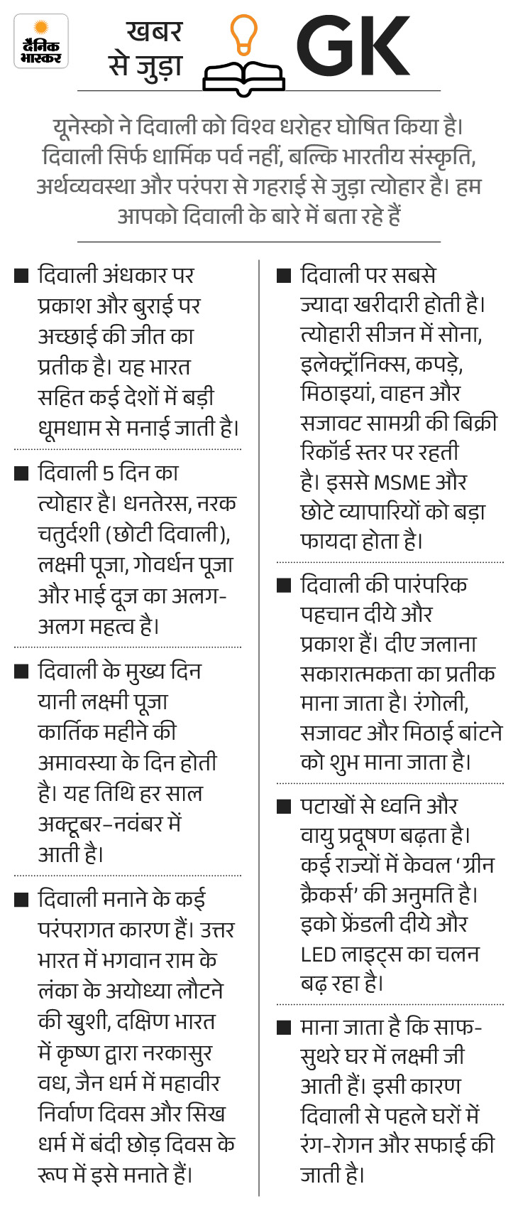 यूनेस्को ने दीवाली को अमूर्त विश्व धरोहर घोषित किया:आज दिल्ली में दीवाली मनेगी; दुर्गा पूजा, कुंभ मेला समेत 15 धरोहरें पहले ही लिस्ट में