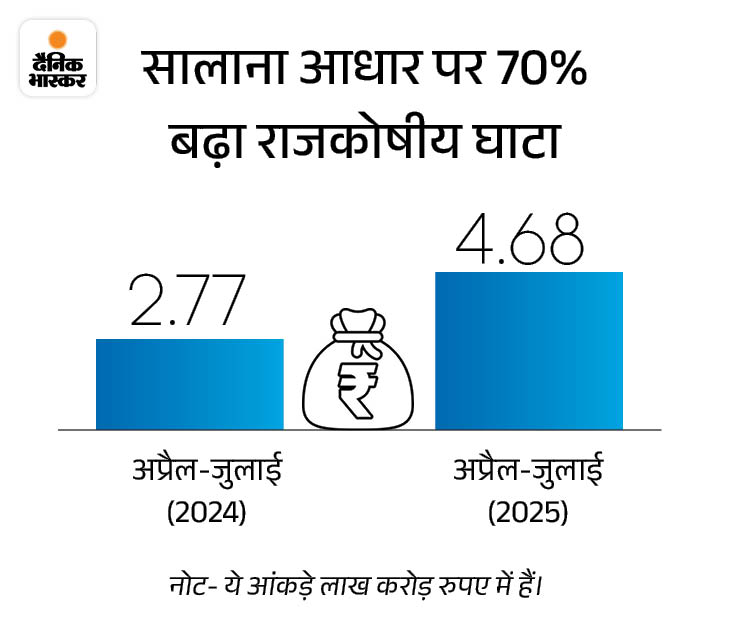 केंद्र सरकार का राजकोषीय घाटा यानी फिस्कल डेफिसिट इस वित्त वर्ष (2025-26) के पहले चार महीनों में सालाना आधार पर 70% बढ़ गया है। कंट्रोलर जनरल ऑफ अकाउंट्स (CGA) के आंकड़ों के मुताबिक, अप्रैल-जुलाई में घाटा ₹4.68 लाख करोड़ रहा, जो पूरे साल के अनुमान का 29.9% है। पिछले साल इसी अवधि में यह ₹2.77 लाख करोड़ था।