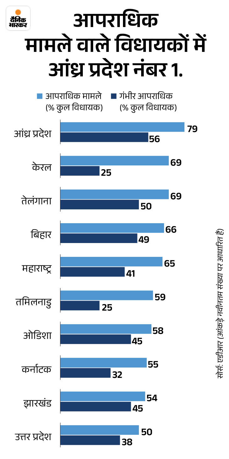 देशभर में 45% विधायकों ने अपने ऊपर क्रिमिनल केस घोषित किए हैं, जबकि 29% गंभीर मामलों का सामना कर रहे हैं। विधायकों पर क्रिमिनल केसों में आंध्र प्रदेश देश में पहले स्थान पर है। इसके बाद केरल, तेलंगाना और बिहार का स्थान है।