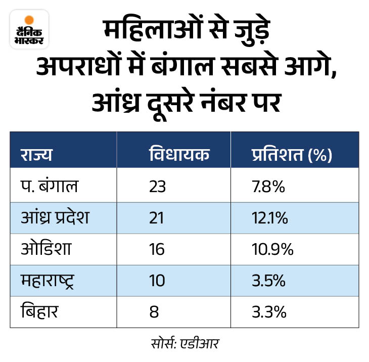 वर्तमान में स्थिति यह है कि देशभर में 45% विधायक और 46% सांसदों पर आपराधिक मामले दर्ज हैं। महिलाओं से जुड़े अपराधों की बात करें तो इसमें पश्चिम बंगाल सबसे आगे है। आंध्र प्रदेश का दूसरा नंबर है।