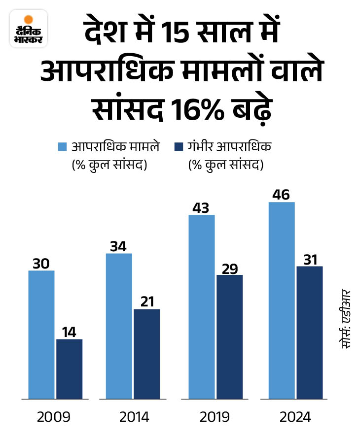2019 में 43% सांसदों पर आपराधिक मामले और करीब 29% पर गंभीर आरोप थे। 2024 के चुनावों के बाद गठित संसद में यह संख्या और बढ़ गई। अभी 46% सांसद आपराधिक मामलों और 31% गंभीर मामलों का सामना कर रहे हैं।