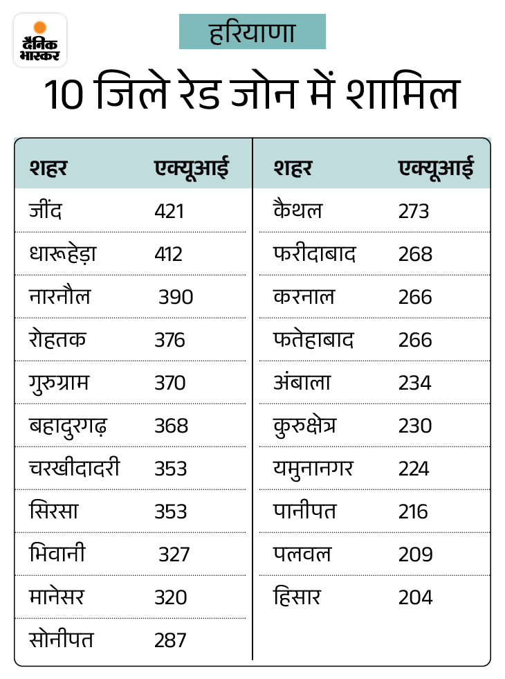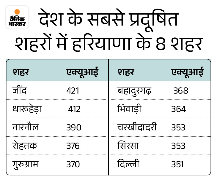 देश में 10 सबसे अधिक प्रदूषित शहरों में 8 हरियाणा के हैं। इनमें जींद, धारूहेड़ा (रेवाड़ी), नारनौल, रोहतक, गुरुग्राम, बहादुरगढ़ (झज्जर), चरखी दादरी और सिरसा शामिल है। जींद और धारूहेड़ा में AQI 400 से ऊपर रहा। राजस्थान का भिवाड़ी प्रदूषण के मामले में 7वें और दिल्ली 10वें नंबर पर है। दिवाली की रात तो हरियाणा के 15 जिलों में AQI 500 तक पहुंच गया था।