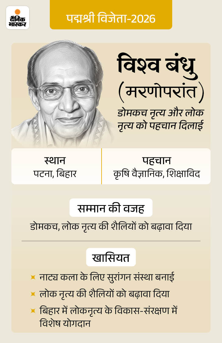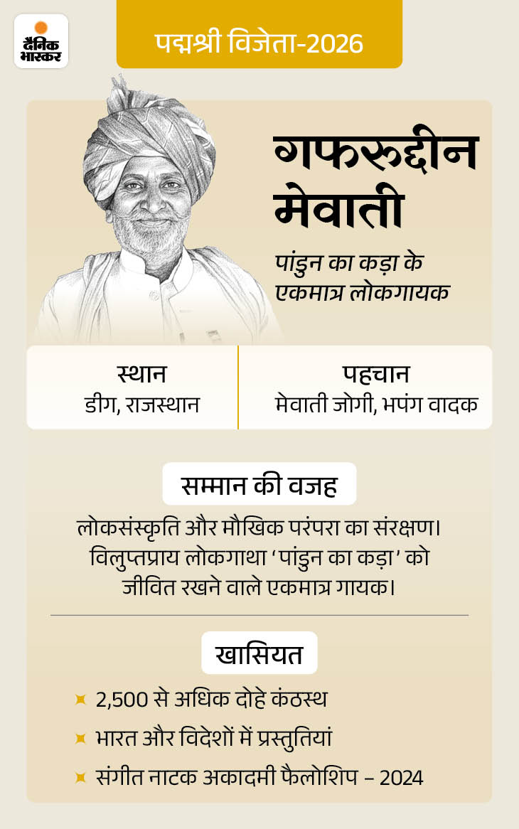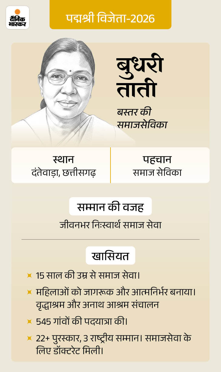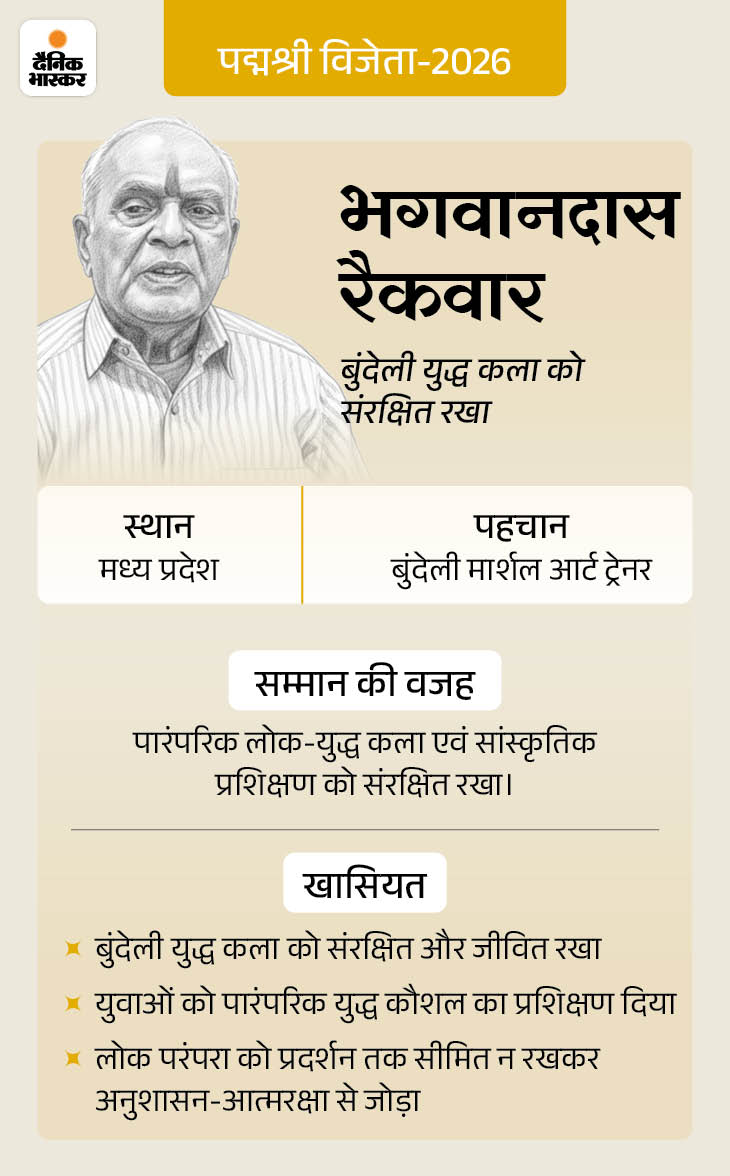 केंद्र सरकार ने 25 जनवरी की शाम पद्म सम्मान की घोषणा की। देश की 113 हस्तियों को पद्मश्री से सम्मानित किया गया है। ये वह लोग हैं जो बिना किसी शोर-शराबे के अपने-अपने क्षेत्रों में सालों से बेहतरीन काम कर रहे हैं। मध्य प्रदेश के भगवानदास रैकवार ने अपनी जवानी बुंदेली युद्ध कौशल को संरक्षित करने में बिता दी। छत्तीसगढ़ की बुधरी ताती 15 साल की उम्र से समाज सेवी में जुटी हैं। इसके चलते उन्होंने शादी भी नहीं की। खबर में जानिए देश के इन्हीं गुमनाम नायकों के बारे में…