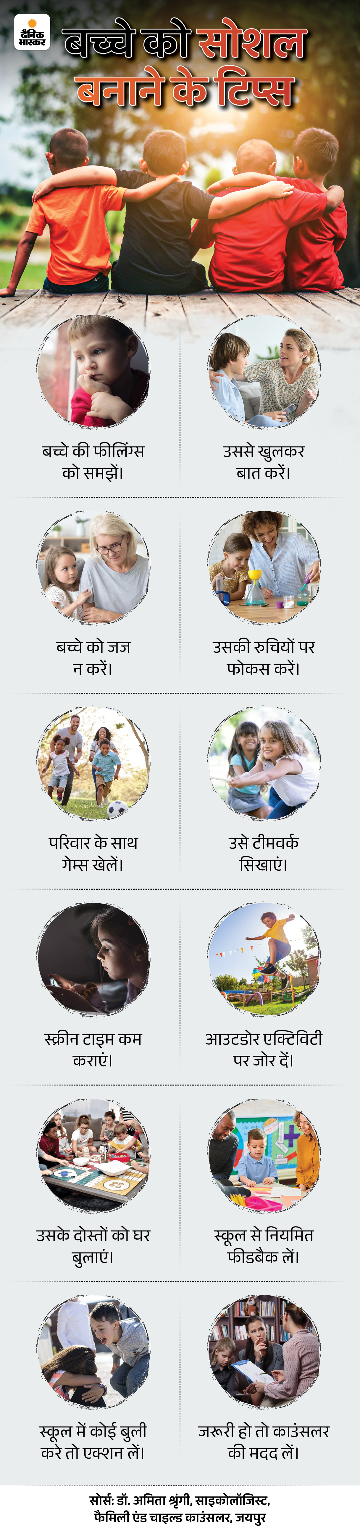 इसका जवाब है, उसे बदलने की कोशिश न करें, बल्कि उसे समझें और स्वीकार करें। बच्चे को उसके कंफर्ट जोन से धीरे-धीरे बाहर लाने की कोशिश करें, न कि दबाव डालकर। उसे छोटे-छोटे सोशल एक्सपीरियंस दें। जैसे ग्रुप एक्टिविटी में शामिल करना, किसी भरोसेमंद दोस्त के साथ खेलने देना या फैमिली गैदरिंग में भाग लेने के लिए प्रेरित करना। सबसे जरूरी है कि वह यह महसूस करे कि आप उसकी भावनाओं को समझते हैं और बिना जज किए उसका साथ दे रहे हैं। बच्चे को सोशल बनाने के लिए नीचे दिए कुछ आसान टिप्स को फॉलो कर सकते हैं।