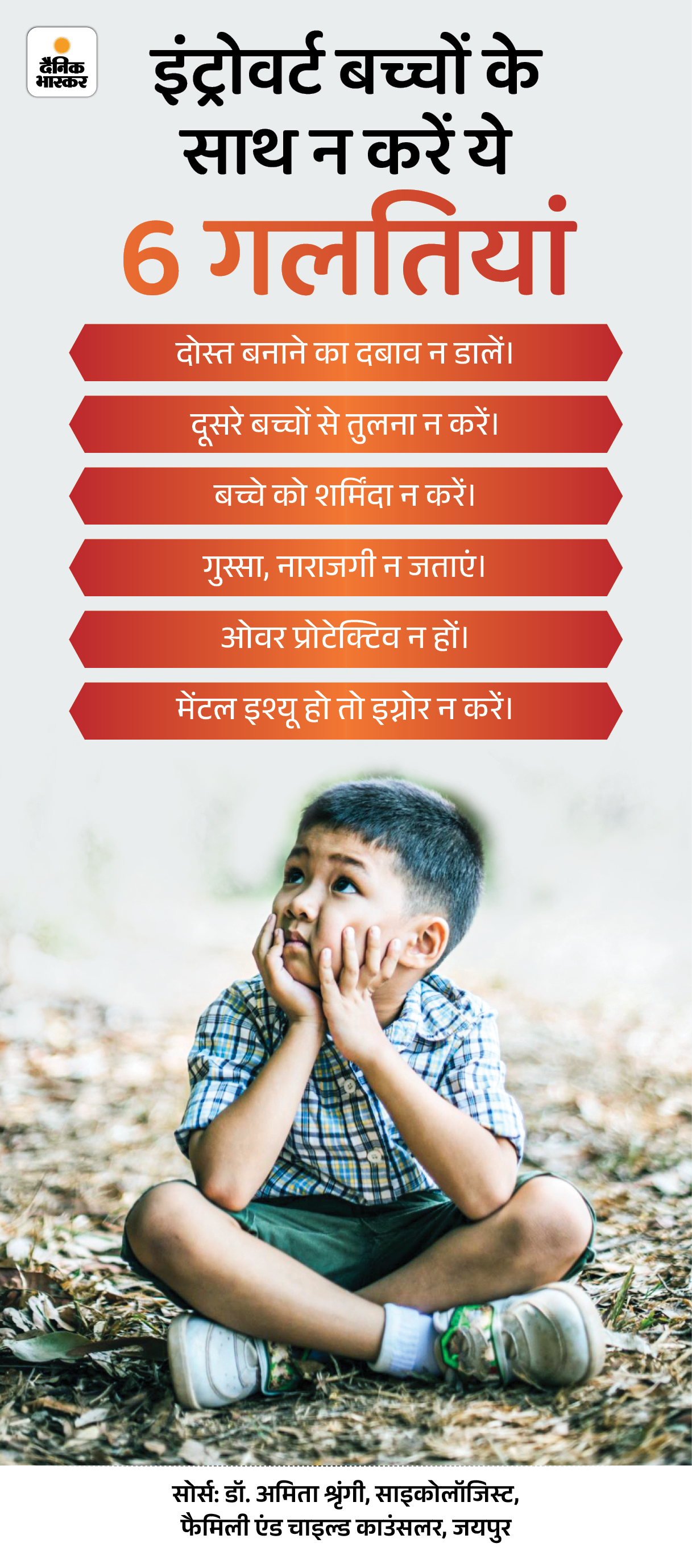 इंट्रोवर्ट बच्चों की परवरिश में ज्यादा धैर्य की जरूरत होती है। अक्सर पेरेंट्स अनजाने में ऐसी गलतियां कर बैठते हैं, जो बच्चे को और ज्यादा अंदर की ओर धकेल देती हैं। ऐसे में कुछ गलतियों से जरूर बचना चाहिए।