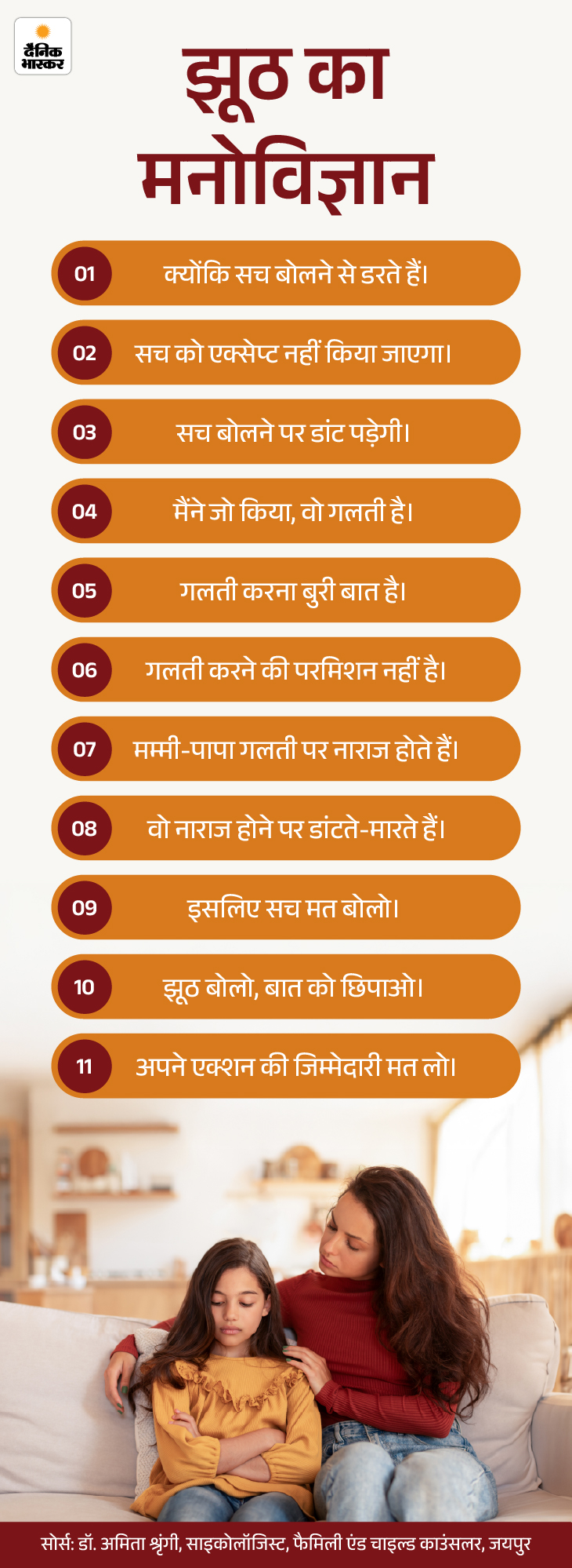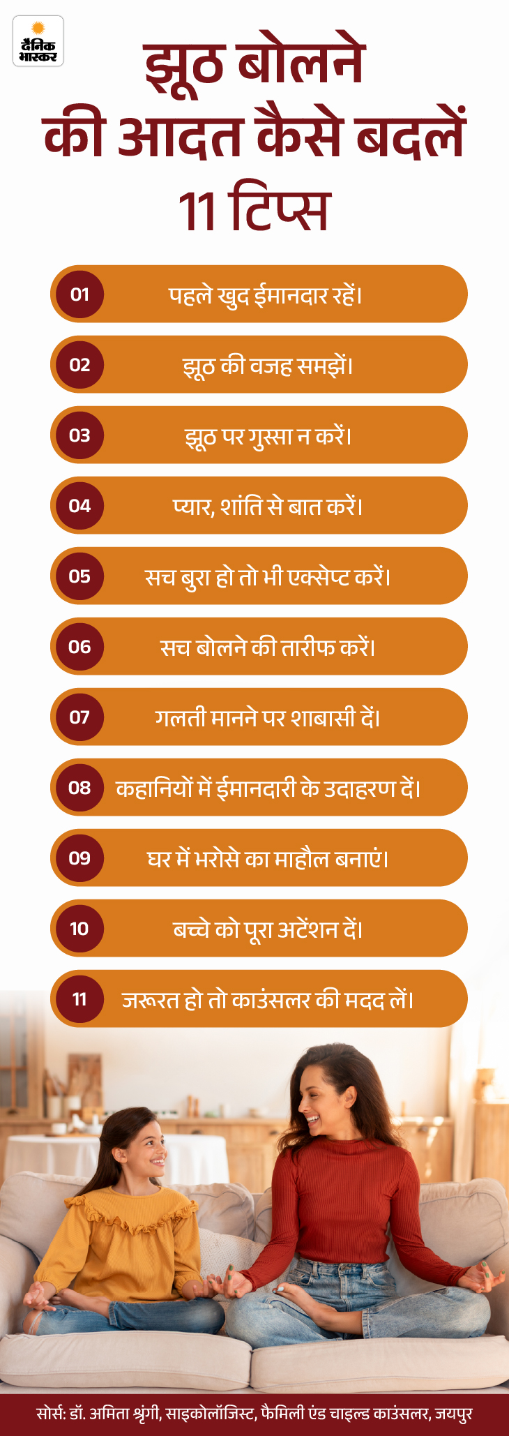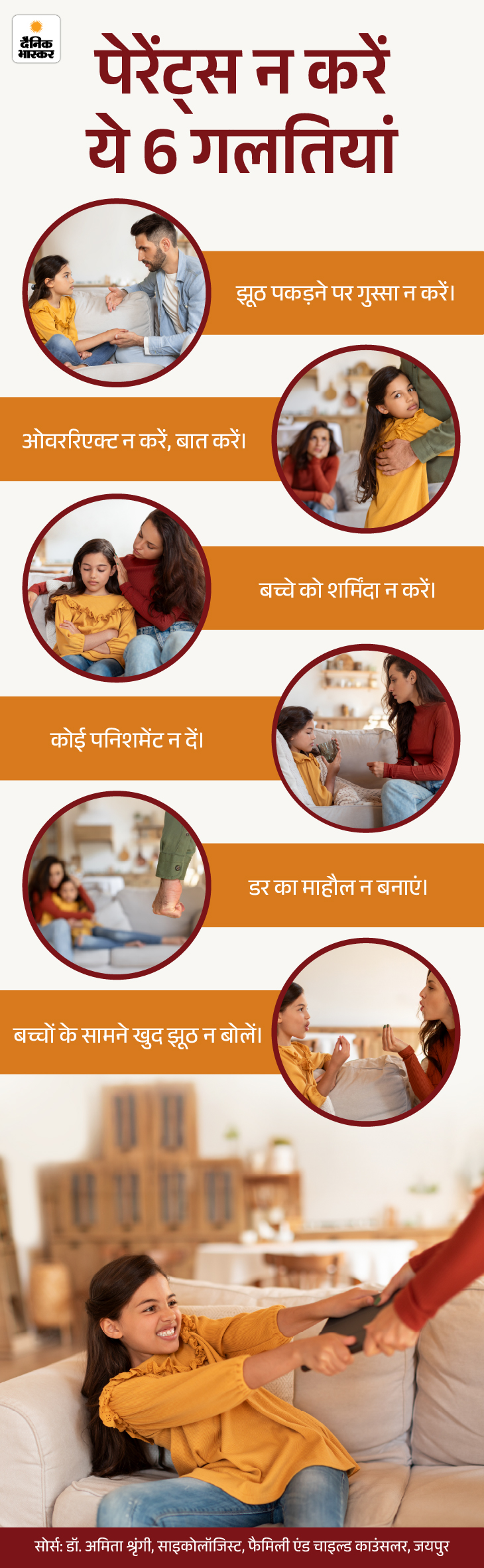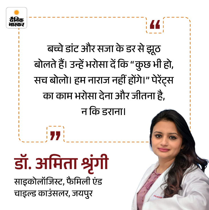 अगर परिवार में ट्रस्ट और ओपन कम्युनिकेशन है तो बच्चा झूठ कम बोलेगा। रोजाना फैमिली टाइम रखें, जहां सब अपनी बातें शेयर करें। इससे वह देखेगी कि सच बोलना घर की संस्कृति है। साथ ही उसकी उम्र को ध्यान में रखें। 5 साल में बच्चे अभी नैतिकता सीख रहे होते हैं, इसलिए धैर्य रखें। बदलाव रातोंरात नहीं आएगा, लेकिन लगातार प्रयास से 2-3 महीनों में फर्क दिखेगा।