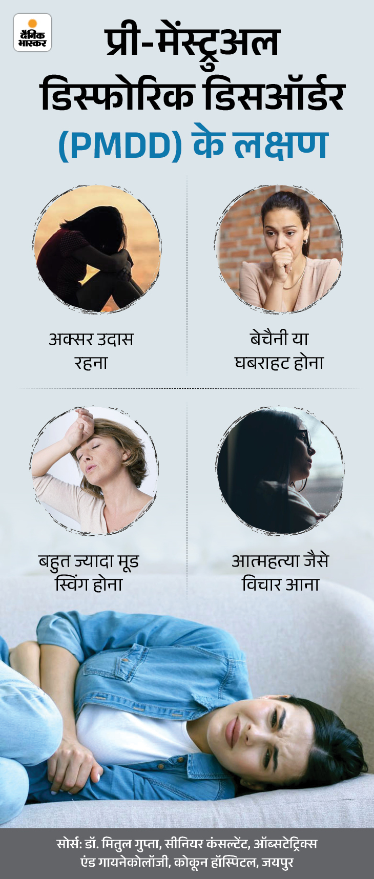 PMS के ज्यादा गंभीर रूप को प्री-मेंस्ट्रुअल डिस्फोरिक डिसऑर्डर(PMDD) कहा जाता है। यह लगभग 5% महिलाओं को प्रभावित करता है। डॉ. मितुल के मुताबिक, ये एक मानसिक स्वास्थ्य संबंधी बीमारी है, क्योंकि इससे गंभीर मानसिक तनाव हो सकता है।