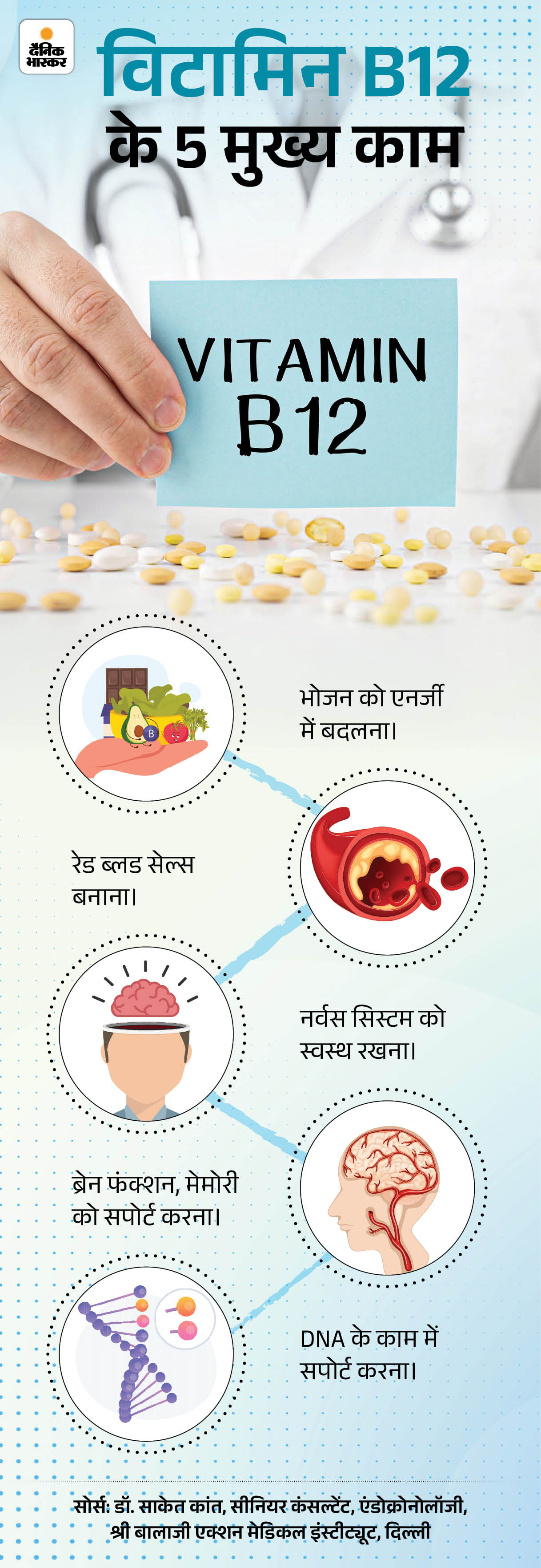 इसके अलावा यह नर्वस सिस्टम और ब्रेन फंक्शन को सपोर्ट करता है। विटामिन B12 DNA में भी महत्वपूर्ण भूमिका निभाता है, जिससे नई कोशिकाओं का निर्माण और शरीर की रिकवरी प्रक्रिया बेहतर होती है। नीचे दिए ग्राफिक से इसके मुख्य कामों को समझिए-