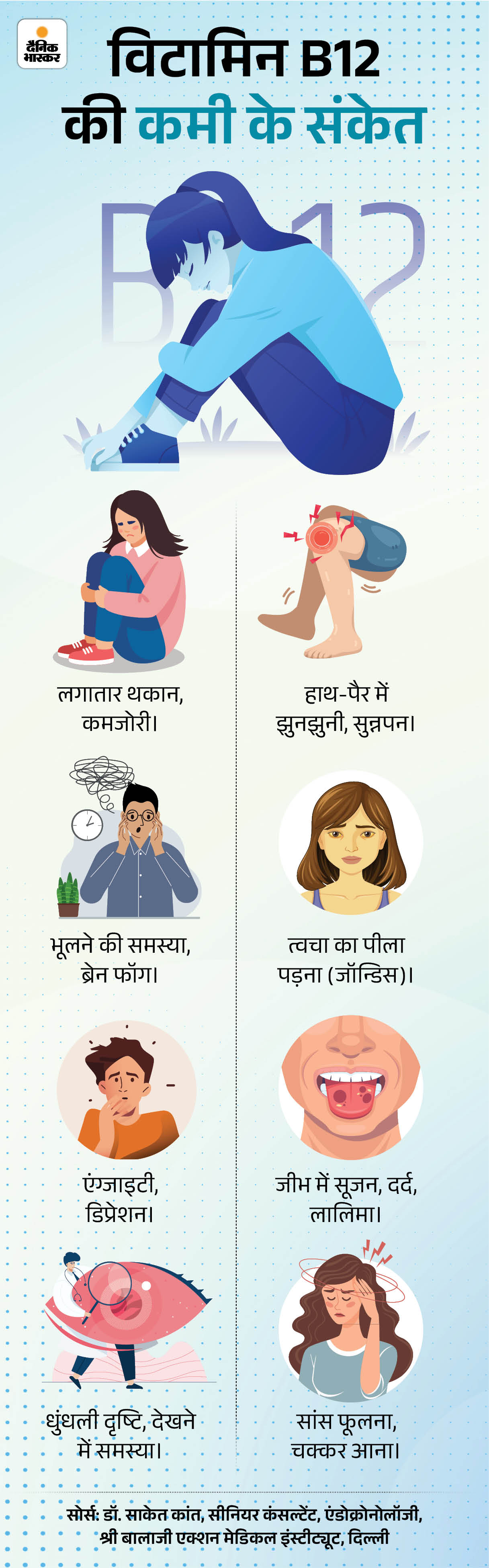 कई बार हाथ-पैरों में झुनझुनी या सुन्नपन, चक्कर आना, मूड स्विंग या डिप्रेशन जैसे लक्षण भी दिखाई देते हैं। स्किन पीली पड़ना, जीभ में जलन या मुंह के छाले भी इसके संकेत हो सकते हैं। समय पर ध्यान न देने पर ये लक्षण धीरे-धीरे गंभीर समस्याओं का रूप ले सकते हैं। नीचे दिए ग्राफिक से 8 मुख्य संकेतों को समझिए-