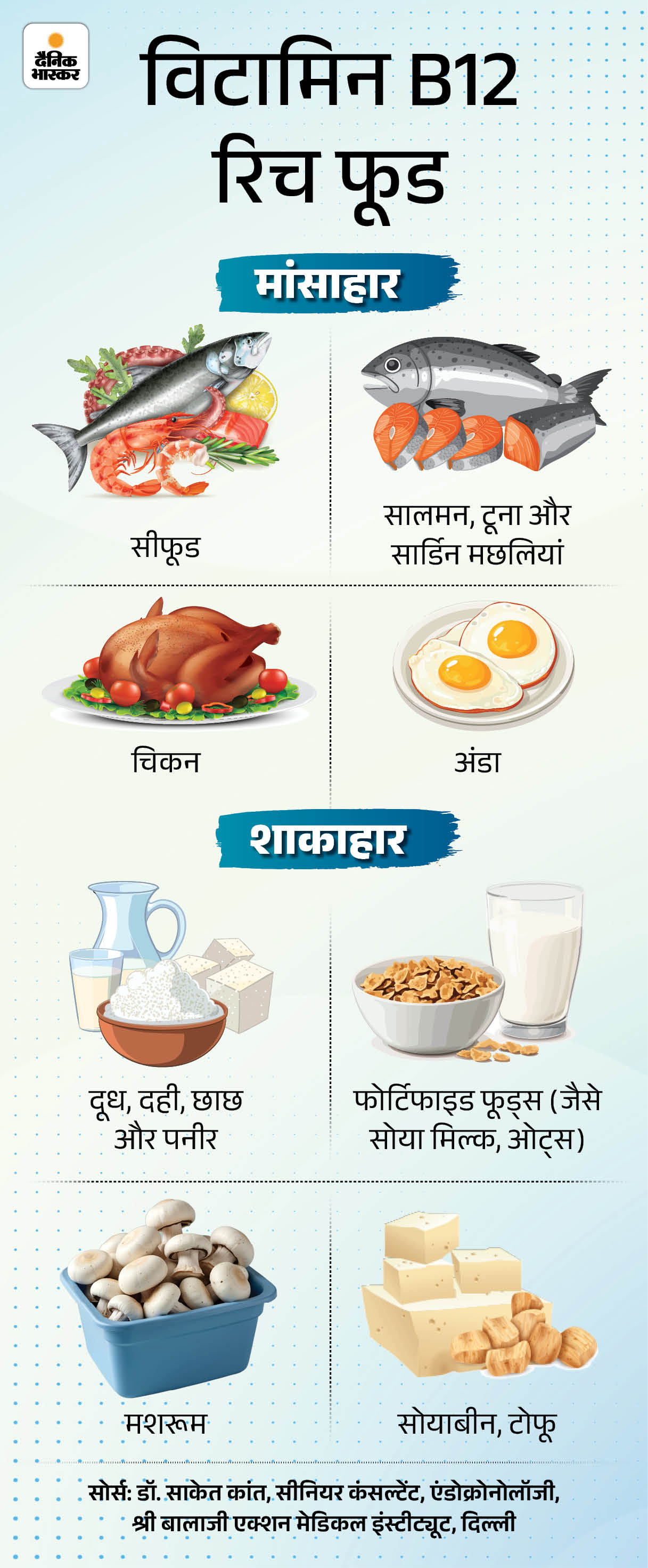 जवाब- विटामिन B12 का मुख्य स्रोत मांस, मछली, अंडे और डेयरी प्रोडक्ट्स जैसे दूध, दही और पनीर हैं। हालांकि शाकाहारी लोगों के लिए इसके सीमित सोर्स ही हैं। जैसे फोर्टिफाइड अनाज, सोया मिल्क या प्लांट-बेस्ड फूड्स, जिनमें यह आर्टिफिशियल तरीके से मिलाया जाता है। नीचे दिए ग्राफिक में देखें कि कौन से फूड्स विटामिन B12 के बेहतर सोर्स हैं।
