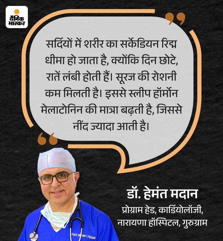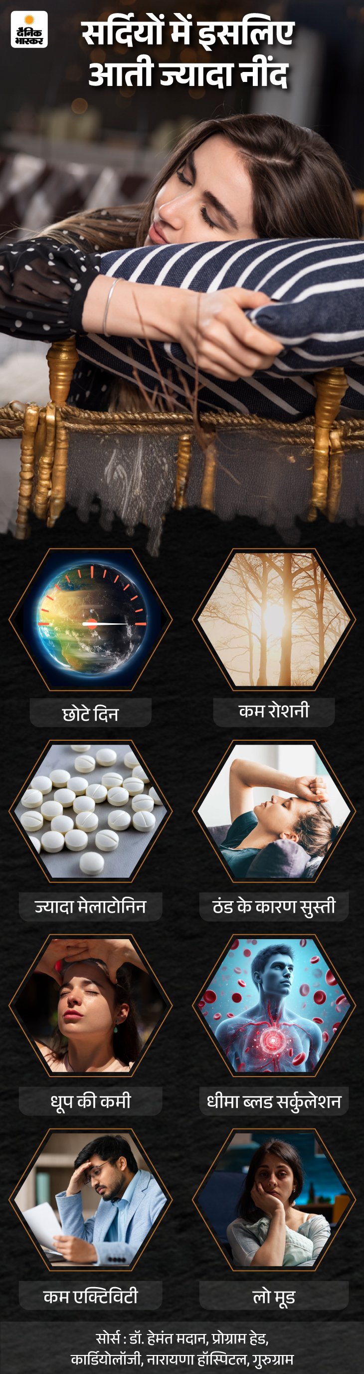 जवाब- सर्दियों में सूरज की रोशनी कम होती है और दिन छोटे होते हैं। इससे शरीर में मेलाटोनिन हॉर्मोन ज्यादा बनने लगता है, जो नींद लाने का काम करता है। ठंड का मौसम भी शरीर को सुस्त और आराम की ओर ले जाता है।
