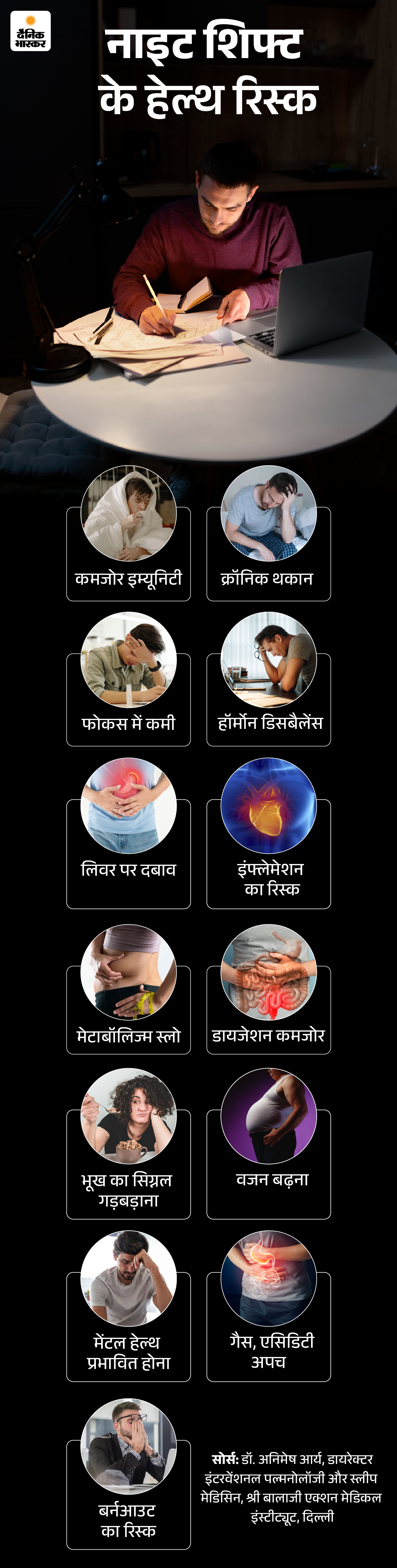 जवाब- नाइट शिफ्ट का खतरा सिर्फ नींद बिगड़ने तक सीमित नहीं होता। रात के समय शरीर खुद को रिपेयर करता है और इम्यून सिस्टम को मजबूत करता है, लेकिन नाइट शिफ्ट में यह नेचुरल रिकवरी प्रोसेस बाधित होता है, जिससे बॉडी को कई नुकसान होते हैं। ग्राफिक से समझते हैं-