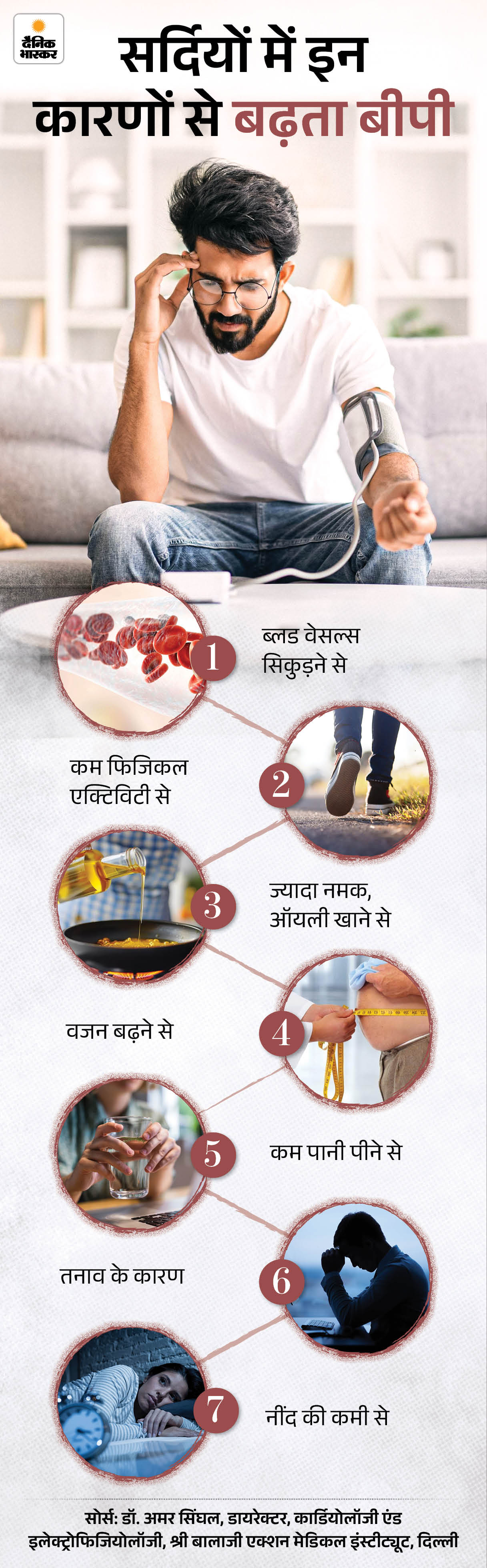 जवाब- सर्दियों में टेम्प्रेचर कम होने से शरीर कई तरह से रिएक्ट करता है। ठंड में ब्लड वेसल्स सिकुड़ जाती हैं, जिसे वैसोकॉन्सट्रिक्शन कहते हैं। ऐसे में ब्लड फ्लो नॉर्मल बनाए रखने के लिए दिल को ज्यादा मेहनत करनी पड़ती है। इसका मतलब है कि हार्ट अधिक मेहनत से ब्लड पंप करता है, जिससे बीपी बढ़ जाता है।