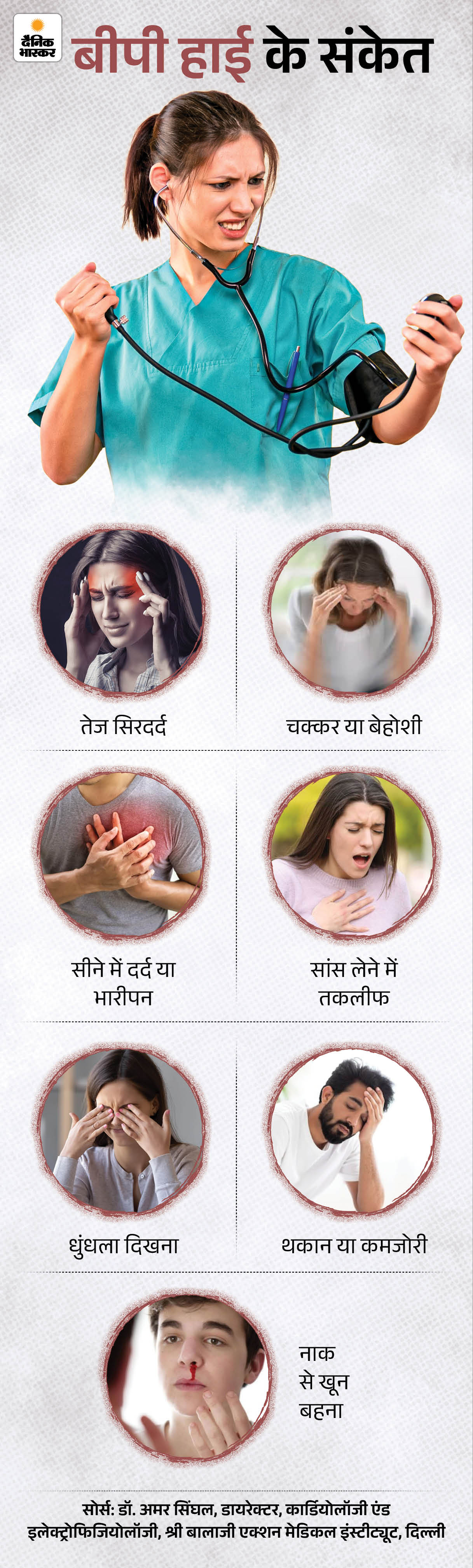 जवाब- शरीर में होने वाले कुछ असामान्य बदलाव ब्लड प्रेशर हाई होने का संकेत देते हैं। इसे नीचे दिए ग्राफिक से समझिए-