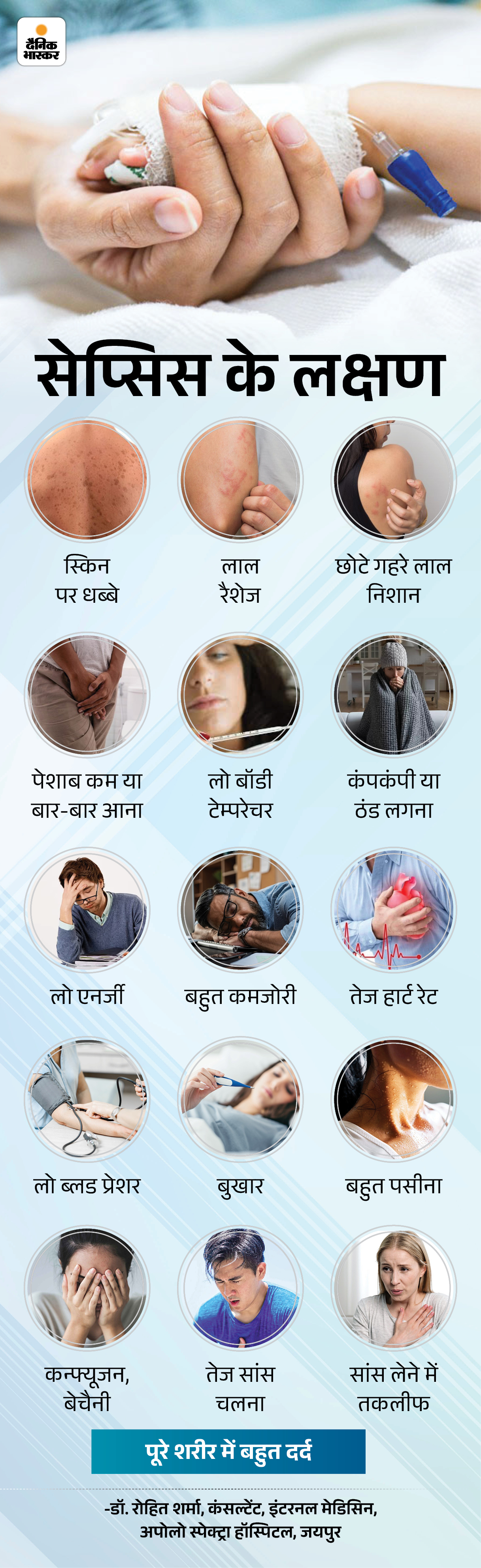 आमतौर पर बुखार या बहुत कम बॉडी टेम्परेचर के साथ धड़कन तेज हो जाती है। कुछ लोगों में स्किन पर लाल या धब्बेदार रैश भी दिखता है। ब्लड प्रेशर गिरने से शरीर में ब्लड सप्लाई कम हो जाती है, जिससे मरीज की हालत तेजी से बिगड़ सकती है। ऐसे में तुरंत अस्पताल जाना जरूरी है, क्योंकि सेप्सिस मिनटों में गंभीर रूप ले सकता है। इसके सभी लक्षण ग्राफिक में देखिए-