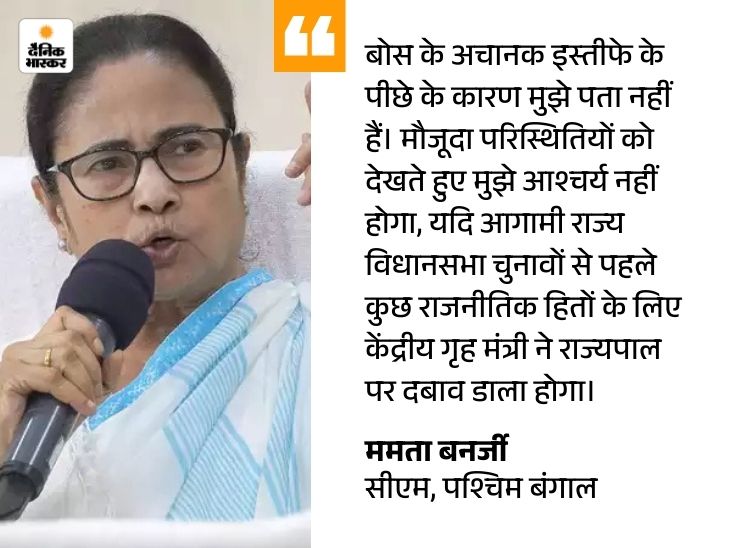 उधर, मुख्यमंत्री ममता बनर्जी ने बोस के इस्तीफे पर हैरानी जताई। उन्होंने बताया कि केंद्रीय गृहमंत्री ने अभी मुझे सूचित किया है कि आरएन रवि को पश्चिम बंगाल का राज्यपाल नियुक्त किया जा रहा है। उन्होंने मुझसे राय नहीं ली है। ये केंद्र का एकतरफा फैसला है।