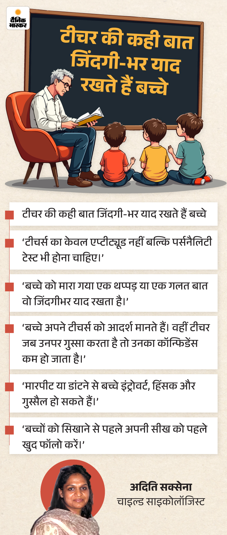 स्कूल में टीचर्स द्वारा बच्चों के साथ दुर्व्यवहार करने को लेकर साइकोलॉजिस्ट अदिति सक्सेना कहती हैं, ‘आजकल स्कूलों में स्टाफ को एप्टीट्यूड टेस्ट के आधार पर भर्ती किया जाता है। यानी उनकी सब्जेक्ट नॉलेज चेक की जाती है। कोई टीचर मैथ्स में कितना अच्छा है, इंग्लिश में कितना अच्छा या हिंदी सब्जेक्ट का कितना ज्ञान है, केवल यही देखा जाता है। कोई भी स्कूल टीचर्स या अन्य स्टाफ को रिक्रूट करते हुए यह नहीं देखता कि उस टीचर का बच्चों के साथ व्यवहार कैसा है, उनसे कैसे बात करता है। वो बच्चों के साथ कनेक्ट कर पाता है या नहीं।’