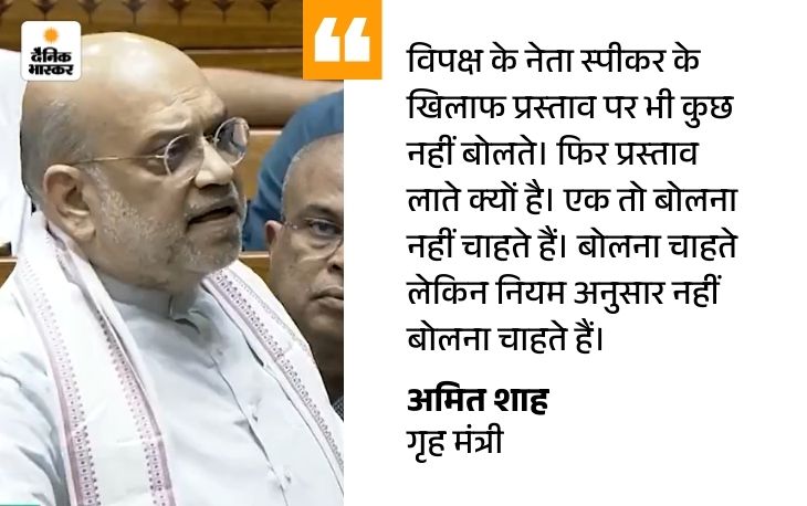 गृह मंत्री अमित शाह ने 56 मिनट तक राहुल के आरोपों और स्पीकर के खिलाफ प्रस्ताव पर सरकार की तरफ से जवाब दिया। शाह ने कहा- जब बोलने का मौका आता है तो राहुल गांधी जर्मनी में होते हैं, इंग्लैंड में होते हैं।