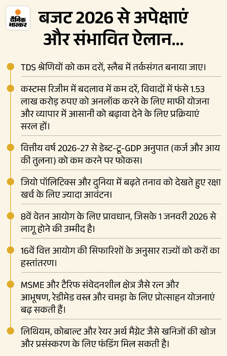 2026 का बजट वित्त मंत्री निर्मला सीतारमण का लगातार नौवां बजट होगा। वित्त मंत्री 7.4% विकास दर और अनिश्चित जियो पॉलिटिक्स के बीच 1 फरवरी को लोकसभा में बजट पेश करने वाली हैं। यह मोदी 3.0 सरकार का तीसरा पूर्ण बजट होगा।