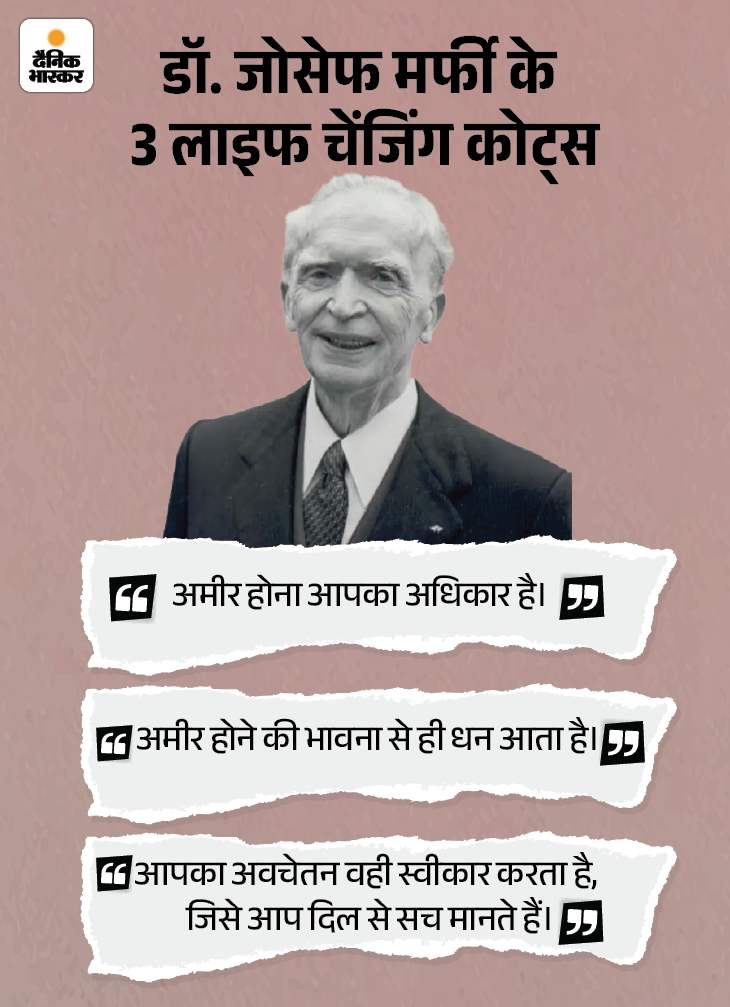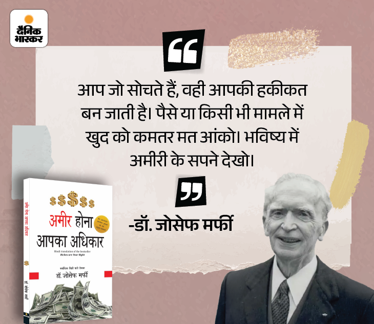 डॉ. जोसेफ मर्फी की किताब ‘अमीर होना आपका अधिकार’ में यह बताया गया है कि अमीरी-गरीबी या किसी भी चीज की शुरुआत सबसे पहले हमारे दिमाग से होती है। हम अपने भविष्य को लेकर जैसा सोचते हैं, वह सबकुछ प्रकृति के सामने मैनिफेस्टेशन की तरह होता है। इसलिए अपने भविष्य की कल्पना करते हुए हमेशा अच्छा और पॉजिटिव सोचना चाहिए। अगर पैसे के बारे में सोच रहे हैं तो सोचिए कि आप बेहद काबिल और अमीर इंसान हैं।