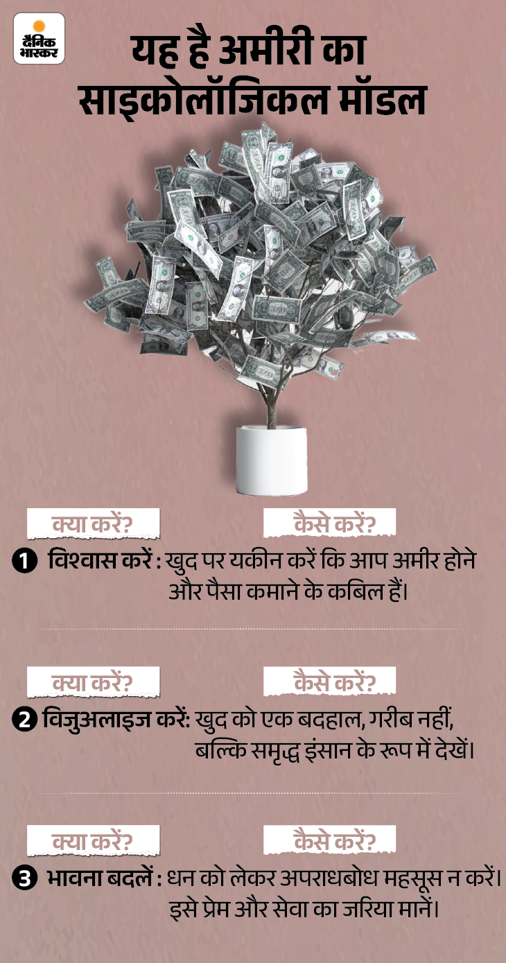 किताब का मूल संदेश है कि हर इंसान को खुशहाल और समृद्ध जीवन जीने का पूरा हक है। पैसा सिर्फ जरूरत नहीं, बल्कि अपने सपनों को पूरा करने का एक जरिया है। हालांकि, इसका मतलब ये नहीं कि आप लालची बनें या दूसरों का हक छीनें, बल्कि ईमानदारी और समझदारी से धन कमाना आपका अधिकार है। यह किताब सिखाती है कि सही सोच, सही नजरिया और मेहनत से हर कोई अमीरी की ओर बढ़ सकता है, बशर्ते वह सबसे पहले खुद को उसके काबिल माने। यह सोच कैसे पैदा होगी, ग्राफिक में देखिए-