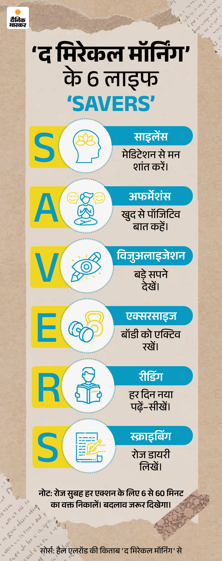 हैल एलरॉड कहते हैं कि असली समस्या नींद की नहीं, बल्कि सुबह उठने में एक्साइटमेंट की कमी है। किताब में उन्होंने ‘S.A.V.E.R.S.’ नामक एक सरल रूटीन दिया है, जो पूरे दिन को ‘मिरेकल’ बनाता है। ये रूटीन रोजमर्रा की जिंदगी के लिए डिजाइन किया गया है। ये न सिर्फ एनर्जी, बल्कि सेल्फ-कॉन्फिडेंस, फोकस और प्रोडक्टिविटी भी बढ़ाता है। नीचे दिए ग्राफिक से इसे समझिए-