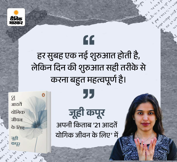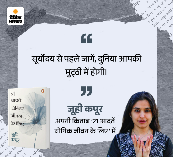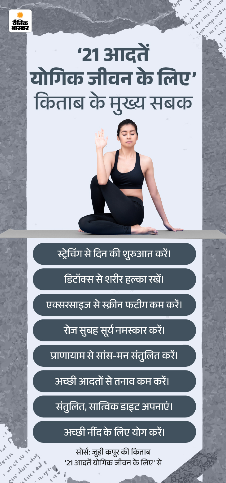 इस किताब में जूही कपूर अपनी गहरी समझ और अनुभव के साथ योगिक लाइफस्टाइल के बारे में विस्तार से बताती हैं। यह किताब उन लोगों के लिए एक दोस्त की तरह है, जो डिजिटल लाइफ के तनाव से जूझ रहे हैं और अपने मन, शरीर और आत्मा में संतुलन चाहते हैं। यह लंबे योग सेशन की बजाय छोटी, व्यावहारिक आदतों पर जोर देती है, जो दिन में एनर्जी और रात की गहरी नींद में मदद करती है। किताब में योगिक जीवन की 21 महत्वपूर्ण आदतें बताई गई हैं। इसे नीचे दिए ग्राफिक से समझिए-