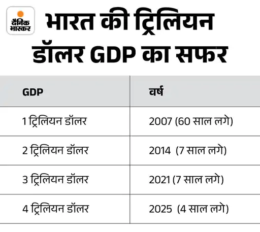 केंद्र का अनुमान है कि मौजूदा रफ्तार बनी रही तो 2030 तक भारत का सकल घरेलू उत्पाद (GDP) 7.3 ट्रिलियन डॉलर (करीब ₹649.70 लाख करोड़) तक पहुंच सकता है। ऐसा हुआ तो भारत जर्मनी को भी पीछे छोड़ देगा। फिलहाल अमेरिका दुनिया की सबसे बड़ी अर्थव्यवस्था है। चीन दूसरे और जर्मनी तीसरे नंबर पर है।