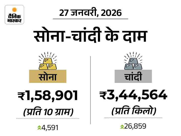 2.चांदी आज ₹26,859 बढ़ी, पहली बार ₹3.44 लाख/kg पहुंची:27 दिन में ₹1.14 लाख महंगी हुई; सोना ₹5 हजार महंगा, ₹1.59 लाख पर पहुंचा