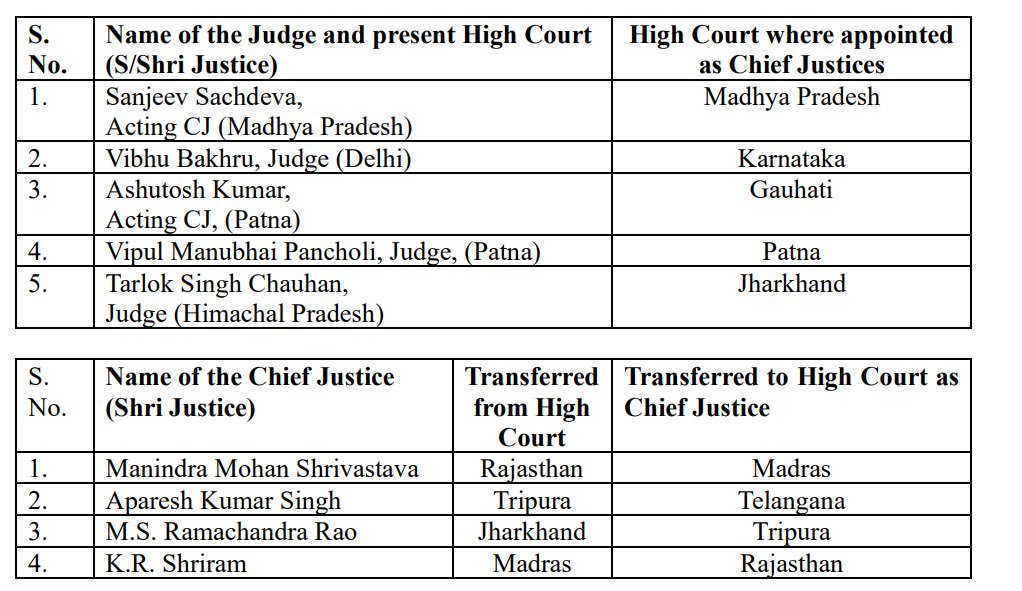 राष्ट्रपति द्रौपदी मुर्मू ने सोमवार को जस्टिस संजीव सचदेवा को मध्य प्रदेश हाईकोर्ट का चीफ जस्टिस नियुक्त किया। वे यहां कार्यवाहक चीज जस्टिस थे। जस्टिस विभु बाखरू को कर्नाटक हाईकोर्ट का चीफ जस्टिस नियुक्ति किया है, बाखरू अभी दिल्ली कोर्ट के जस्टिस थे। जस्टिस आशुतोष कुमार को पटना हाईकोर्ट के कार्यवाहक चीफ जस्टिस से हटाकर गुवाहाटी हाईकोर्ट की चीफ जस्टिस बनाया है। पटना हाईकोर्ट के जस्टिस विपुल मनुभाई पंचोली को यहीं का मुख्य न्यायाधीश नियुक्त किया है। हिमाचल प्रदेश हाईकोर्ट के जस्टिस तरलोक सिंह चौहान को झारखंड हाईकोर्ट का CJ नियुक्त किया है।