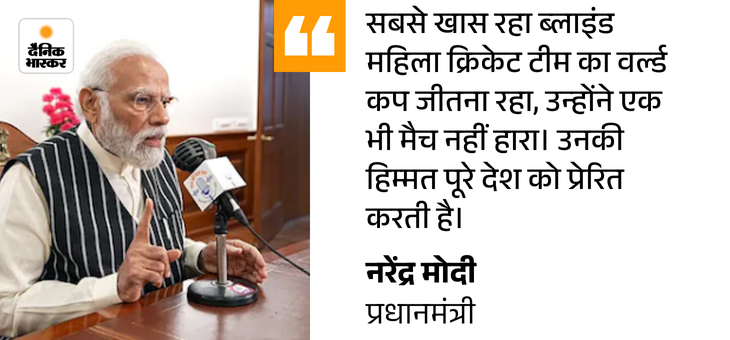PM ने कहा कि भारतीय खेलों के लिए यह महीना शानदार रहा। शुरुआत महिला टीम की ICC महिला वर्ल्ड कप जीत से हुई। भारत को कॉमनवेल्थ खेलों की मेजबानी का भी ऐलान हुआ। टोक्यो में हुए डेफ ओलिंपिक्स में भारत ने रिकॉर्ड 20 मेडल जीते। महिला कबड्डी टीम ने वर्ल्ड कप जीतकर इतिहास रचा और बॉक्सिंग कप में भी भारत ने 20 मेडल हासिल किए।
