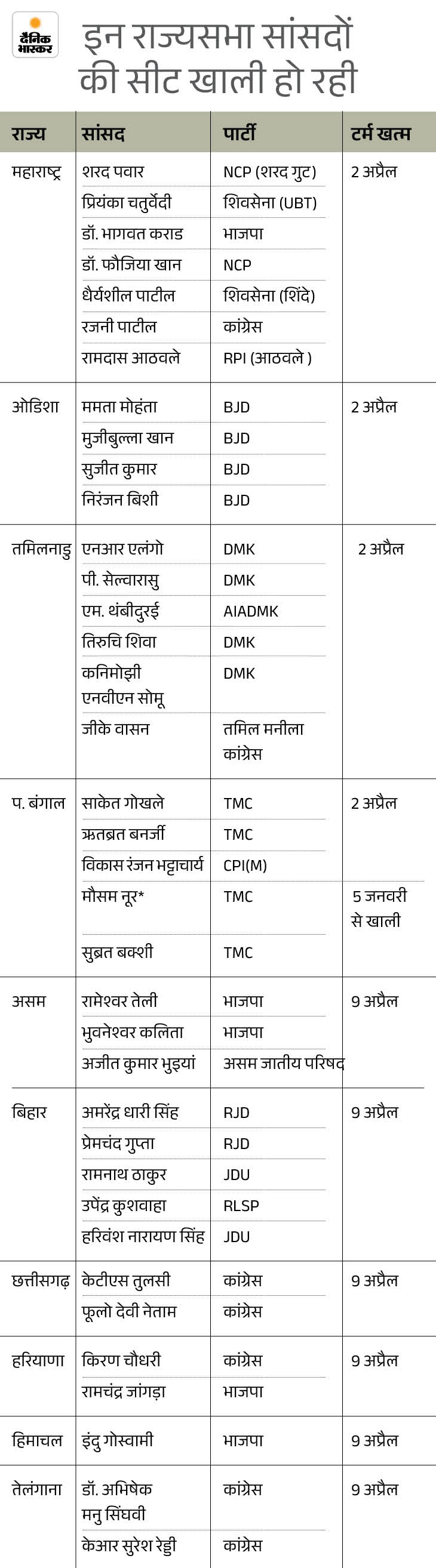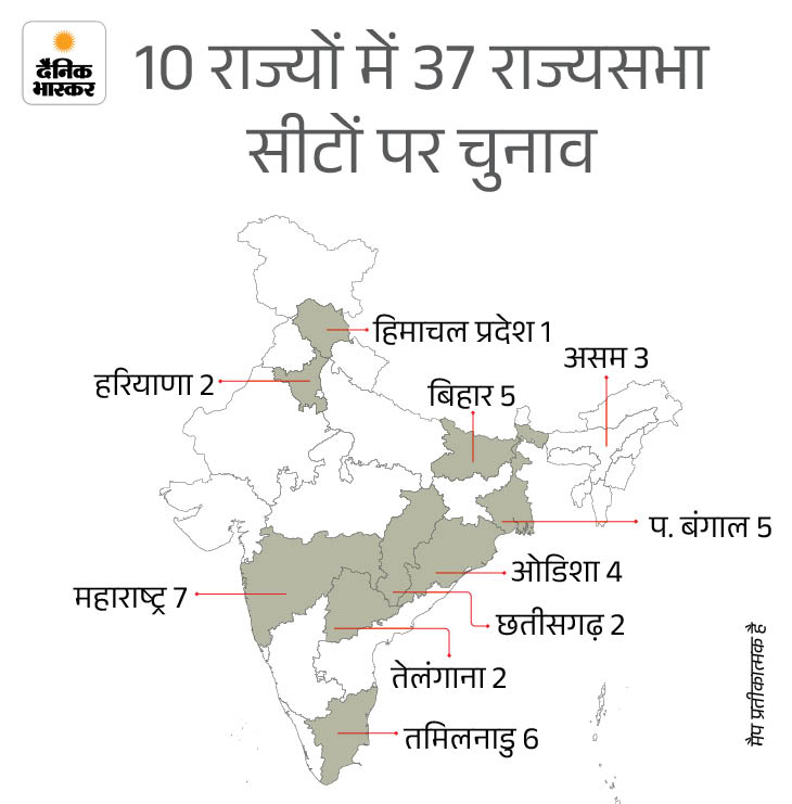 सबसे ज्यादा महाराष्ट्र की 7, तमिलनाडु की 6 और पश्चिम बंगाल-बिहार की 5-5 सीटों पर चुनाव कराया जाना है। शरद पवार, रामदास अठावले, कणिमोझी, तिरुचि शिवा, राज्यसभा के उपसभापति हरिवंश का कार्यकाल 2 अप्रैल को समाप्त हो रहा है।