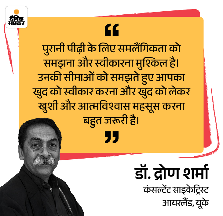 जवाब– मैं आपकी परेशानी समझ सकता हूं। यह स्थिति किसी के लिए भी बहुत मुश्किल और तकलीफदेह हो सकती है। 30 सालों से एक मनोचिकित्सक के तौर पर, खासकर समलैंगिक व्यक्तियों और भारतीय परिवारों के साथ काम करते हुए मैंने ऐसे कई मामले देखे हैं, जहां सायलेंस और रिजेक्शन, खुले टकराव से भी ज्यादा चुभता है। आपकी कहानी बताती है कि भारतीय परिवारों में आज भी समलैंगिकता एक बड़ा टैबू है। इसे सहजता से स्वीकार करना आज भी बहुत मुश्किल है। कानून ने भले ही अधिकार दे दिए हों, लेकिन सामाजिक और पारिवारिक मानसिकता को बदलने में समय लगता है।