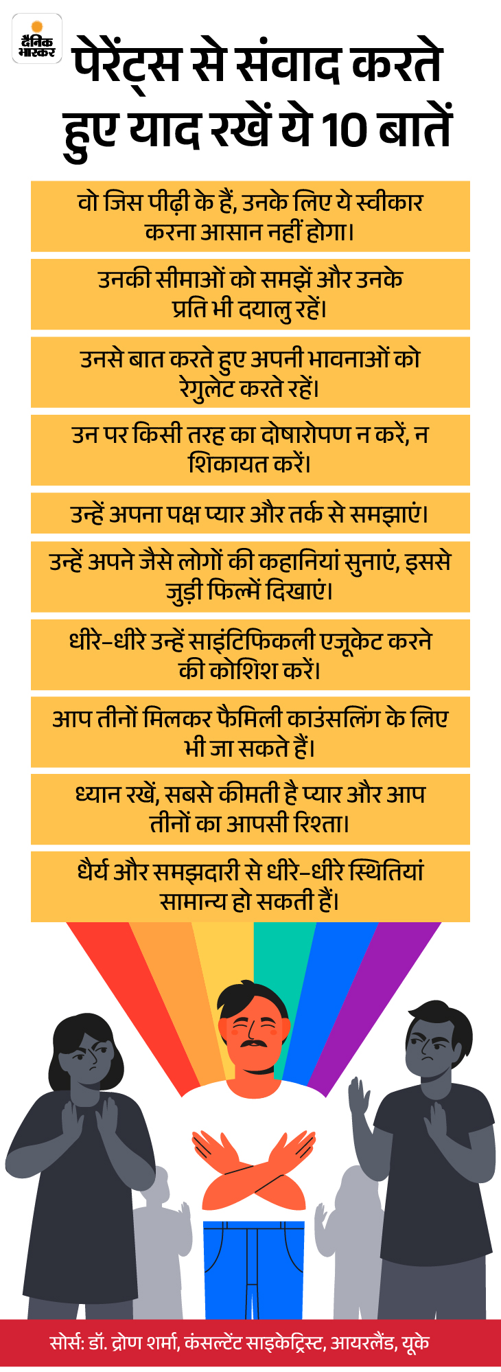 शुरू में सभी के लिए बात करना और फैक्ट को स्वीकार करना मुश्किल होगा। लेकिन अगर प्यार, समझदारी और जिम्मेदारी से पहल की जाए, एक–दूसरे को समय और मौका दिया जाए तो इस बात की संभावना है कि वक्त के साथ चीजें बेहतर हो जाएंगी। यहां ज्यादा समझदारी आपको दिखानी है और पूरी तैयारी के साथ पहल करनी है। बात करते हुए पॉजिटिव रहना है। उनका मन जरूर बदलेगा। …………………… ये खबर भी पढ़िए… मेंटल हेल्थ- बचपन में मम्मी–पापा ने मुझे छोड़ दिया:नाना–नानी ने पाला, नानी के जाने के बाद से मैं गहरे डिप्रेशन में हूं, मैं क्या करूं