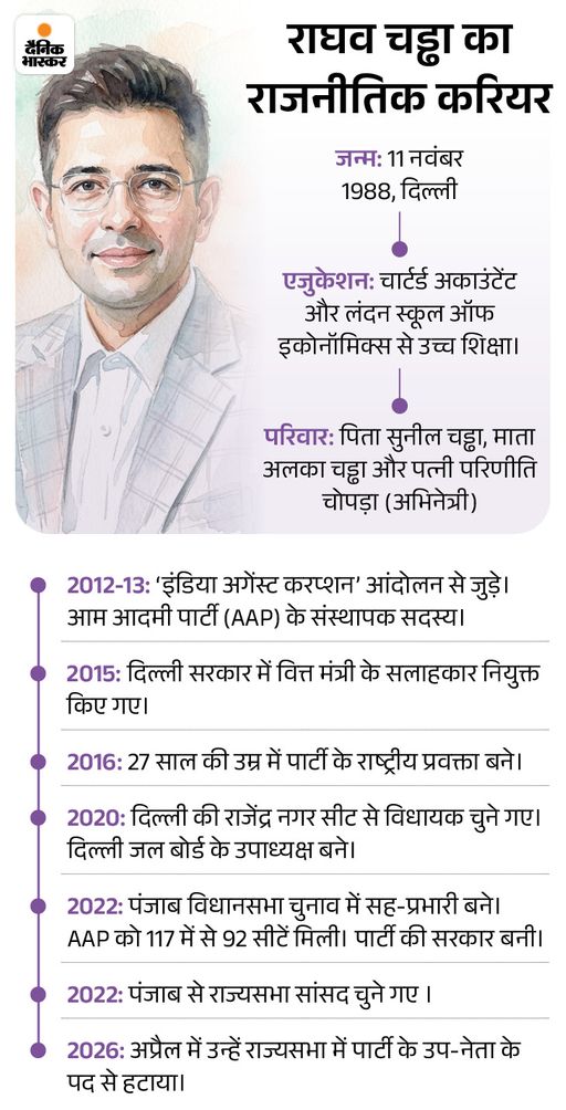 राघव 2022 से पंजाब से राज्यसभा सांसद हैं। उनका कार्यकाल 2028 तक है। हालांकि, राघव चड्ढा ने लंबे समय से पार्टी से दूरी बना ली थी और AAP को लेकर कोई बयान नहीं दिया। यहां तक कि पार्टी प्रमुख अरविंद केजरीवाल के जेल जाने के वक्त वह UK में थे। शराब घोटाला मामले में केजरीवाल के बरी होने पर भी उन्होंने एक शब्द नहीं कहा था।