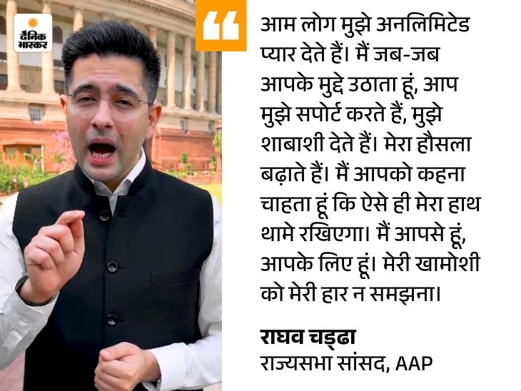 राघव चड्ढा ने कहा कि मैंने पब्लिक के मुद्दे उठाए, इससे AAP को क्या नुकसान हुआ? वीडियो के आखिर में उन्होंने AAP को चेतावनी दी कि आवाज खामोश कराने वालों के सामने मैं सैलाब बनकर आऊंगा। हालांकि, राघव ने न तो पार्टी के किसी नेता का नाम लिया और न ही पार्टी छोड़ने या आगे की रणनीति को लेकर कुछ कहा।