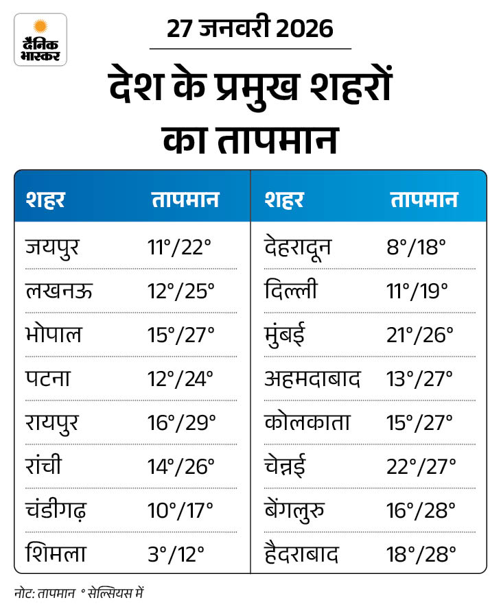 - दिल्ली- सफदरजंग में न्यूनतम तापमान 4.2°C और अयानगर में 3.6°C दर्ज हुआ। वहीं, AQI 241 खराब श्रेणी में दर्ज किया गया। मंगलवार को हल्की बारिश का यलो अलर्ट जारी है।