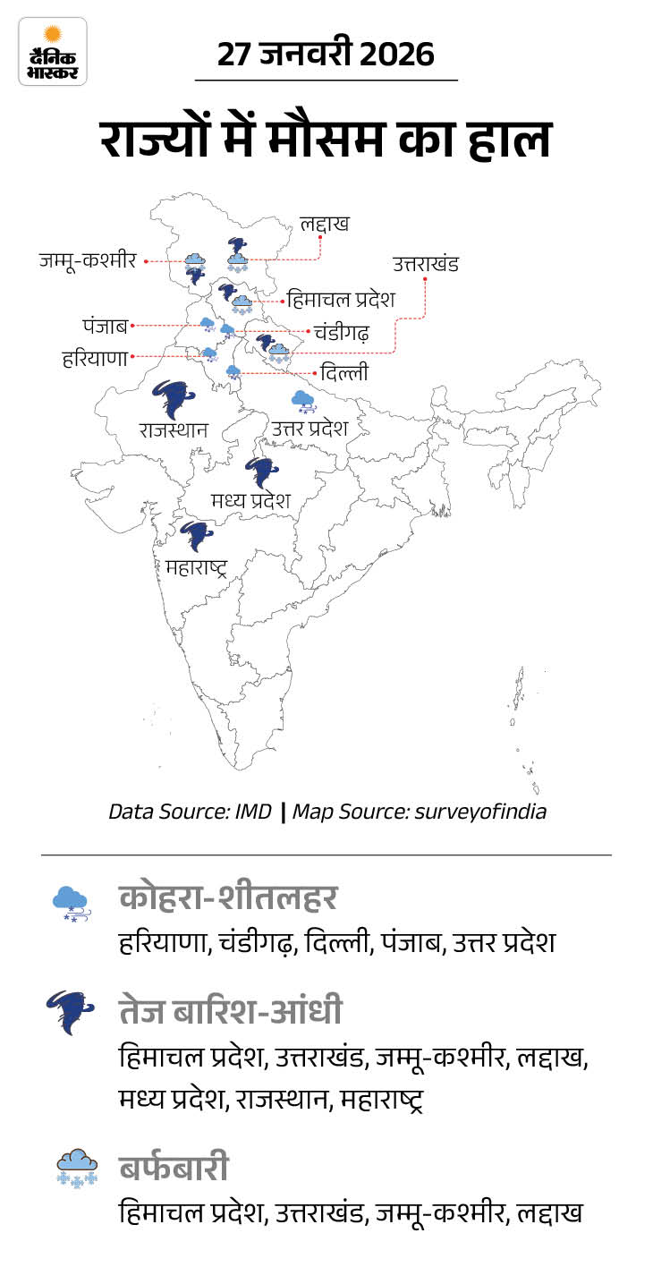 उत्तर भारत के हिमालयी क्षेत्रों में बर्फबारी से मैदानी इलाकों में ठंड बढ़ी है। मौसम विभाग के मुताबिक नया पश्चिमी विक्षोभ सक्रिय होने से अगले 2–3 दिन में जम्मू-कश्मीर, हिमाचल और उत्तराखंड में बारिश-बर्फबारी, जबकि मध्य प्रदेश, राजस्थान और महाराष्ट्र में आंधी-बारिश के आसार हैं।