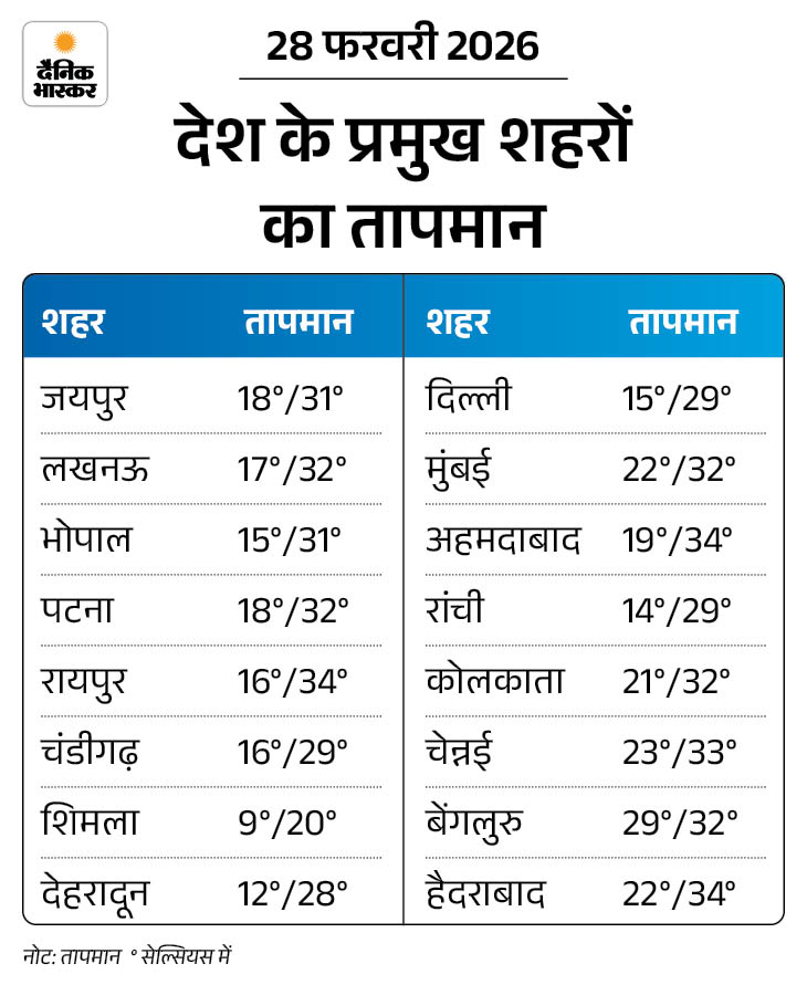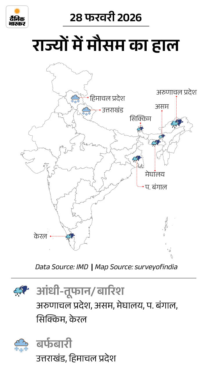 1 मार्च- पश्चिम बंगाल और सिक्किम में आंधी-तूफान के साथ बिजली गिरने की आशंका है। बारिश भी हो सकती है। उत्तराखंड और हिमाचल प्रदेश में बारिश या बर्फबारी हो सकती है।