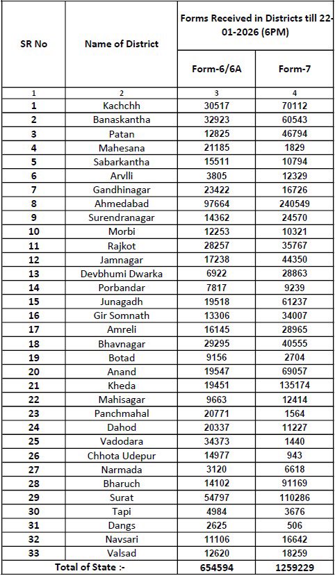 गुजरात कांग्रेस का दावा है कि नियमों के तहत SIR के बाद चुनाव आयोग ने ड्राफ्ट वोटर लिस्ट जारी की। जनता से आपत्तियां दर्ज कराने का कहा। इसकी लास्ट डेट 18 जनवरी तय की गई थी। 15 जनवरी तक कुछ ही आपत्तियां आईं, लेकिन इसके बाद अचानक लाखों आपत्तियां (फॉर्म-7) दाखिल की गईं।