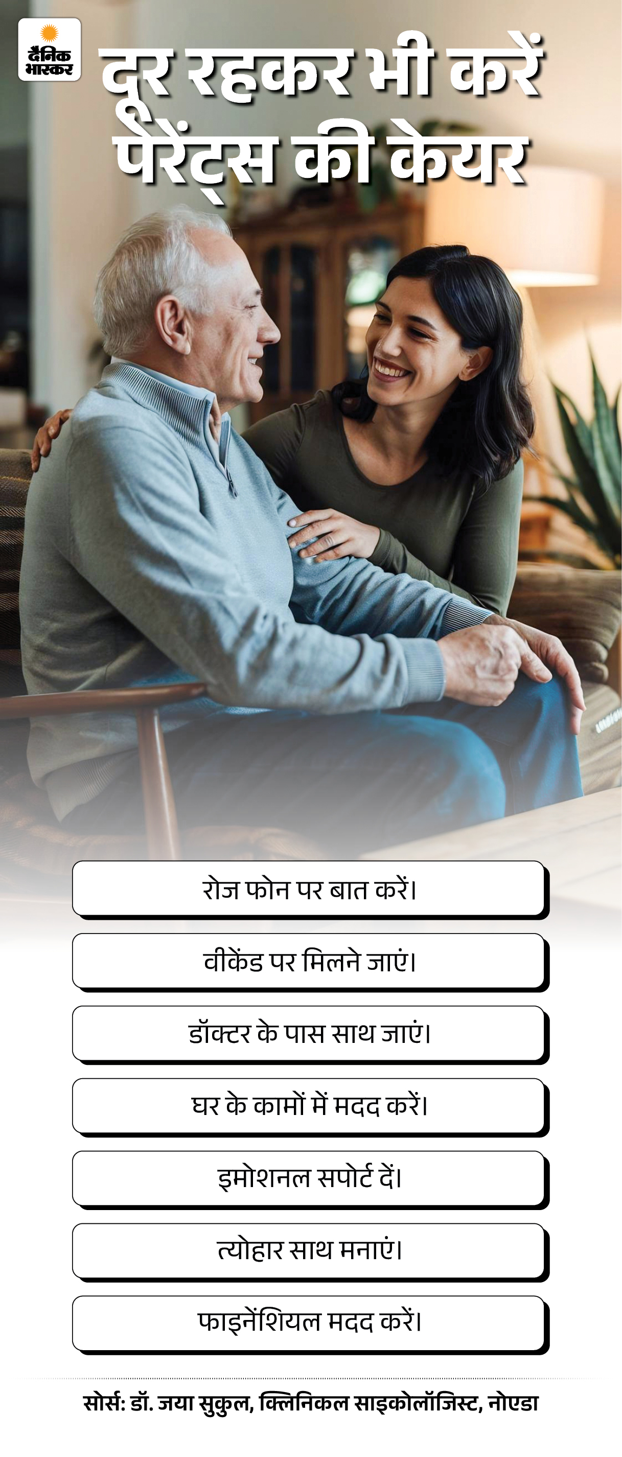 यहां एक बहुत महत्वपूर्ण फर्क को समझना जरूरी है। पेरेंट्स का ख्याल रखना और उनके साथ रहना, दोनों एक ही बात नहीं है। आप उनसे दूर रहते हुए भी उनकी हर जरूरत का ध्यान रख सकते हैं। उनकी सेहत की, दवाइयों की, डॉक्टर के अपॉइंटमेंट्स की जिम्मेदारी ले सकते हैं। जरूरत पड़ने पर तुरंत उनके पास पहुंच सकते हैं, वीकेंड पर उनके साथ समय बिता सकते हैं, पूरे परिवार के साथ बैठकर खाना खा सकते हैं। पेरेंट्स को बच्चों की 24×7 मौजूदगी नहीं चाहिए होती। उन्हें यह भरोसा चाहिए होता है कि जरूरत के वक्त उनका बच्चा उनके साथ खड़ा है।