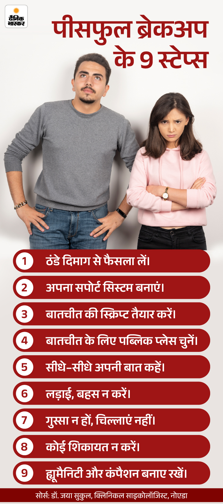आमतौर पर लोग ऐसा कहते हैं कि मैं बिना तुम्हारे मर जाऊंगा या सबको बता दूंगा तो शांत रहें। उसे स्पष्ट तौर पर कहें कि मेरा फैसला पक्का है। इसके बाद वहां से चले जाएं। अगर वह परेशान करे तो कॉलेज काउंसलर या वॉर्डन को बताएं। आपकी अपनी सेफ्टी पहले है।