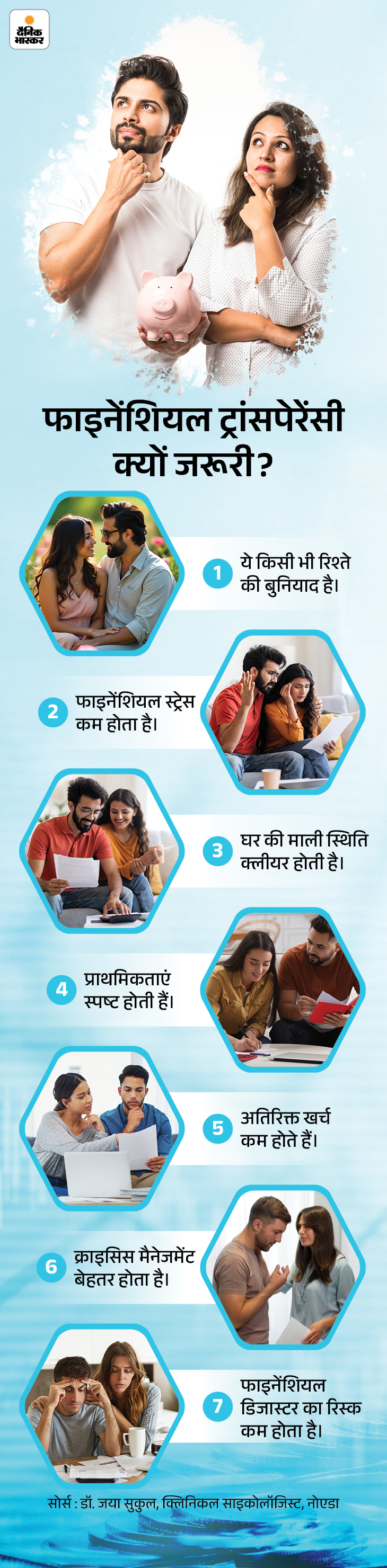 अगर इस बारे में सोचकर आप असुरक्षा महसूस कर रही हैं तो ये नॉर्मल है। आपके मन में यह सवाल पैदा हो रहा है तो धीरे-धीरे रिश्ते में यह एक बड़ी दीवार खड़ी कर सकता है। हर इंसान चाहता है कि रिश्ते में उसकी बराबर की भागीदारी हो। फाइनेंशियल ट्रांसपेरेंसी क्यों जरूरी है, ग्राफिक में देखिए-