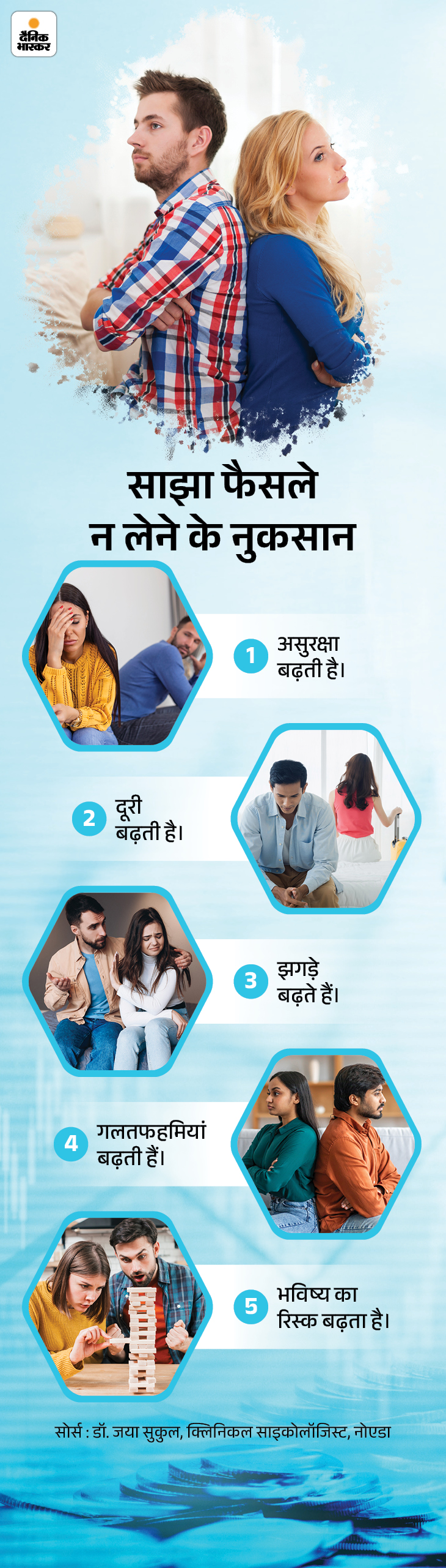 अगर किसी महिला को कभी भी फाइनेंशियल डिसीजन्स में इन्वॉल्व नहीं किया गया है। अचानक उसके पति के साथ कोई ट्रैजेडी हो जाती है तो वह एकदम से सबकुछ नहीं संभाल पाएगी। किसी के साथ कभी भी कोई भी परिस्थिति बन सकती है। ऐसे में सिर्फ महिला के लिए नहीं, बल्कि पूरे परिवार के लिए रिस्क होता है। साझा फैसले न लेने के कई नुकसान होते हैं, ग्राफिक में देखिए-