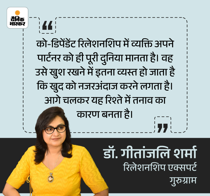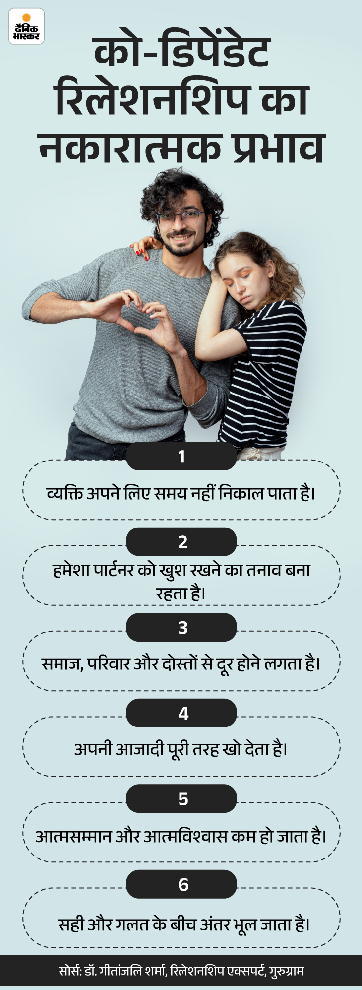 को-डिपेंडेंट रिलेशनशिप में व्यक्ति पार्टनर की जरूरतों और खुशियों के लिए अपनी इच्छाओं, जरूरतों और पहचान को खत्म कर देता है। इस तरह का रिश्ता अनहेल्दी होता है क्योंकि इसमें व्यक्ति पूरी तरह से पार्टनर पर निर्भर रहता है। वह उसके बिना अधूरा महसूस करता है।